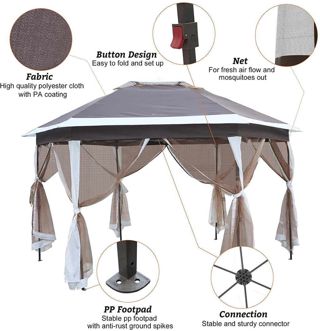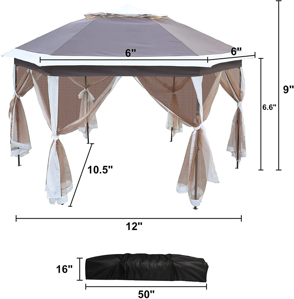 12 ft x 12 ft outdoor hexagonal gazebo, hexagon side length: 6’. Perfect for beach holidays, outdoor picnics, parties and other group activities. It's also possible to buy many for large party.