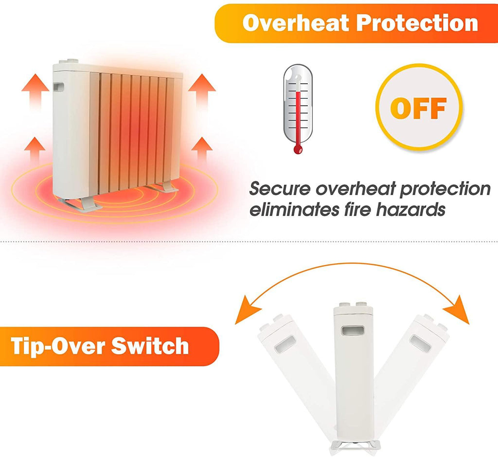 Fast Heating: The graphene quick-heating anti-scalding oil heater can heat up quickly and has low noise, allowing your room to heat up in a short time. Heating range: 161-215 sq.ft.