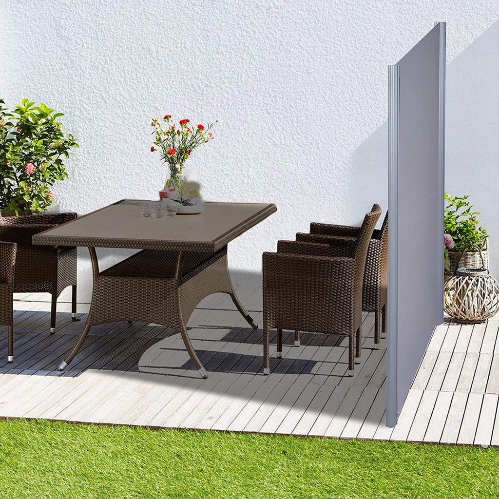Our garden side awning, featuring a large screen, presents an effective way to deal with a constant wind and low-lying sun, while providing privacy. The simple yet stylish design makes it an ideal complement for your garden, patio, balcony, etc. The privacy screen has an automatic roll-back function and the width is adjustable to up to 118 inches. The outdoor screen is made of UV-proof, tear-resistant and water-resistant polyester fabric.