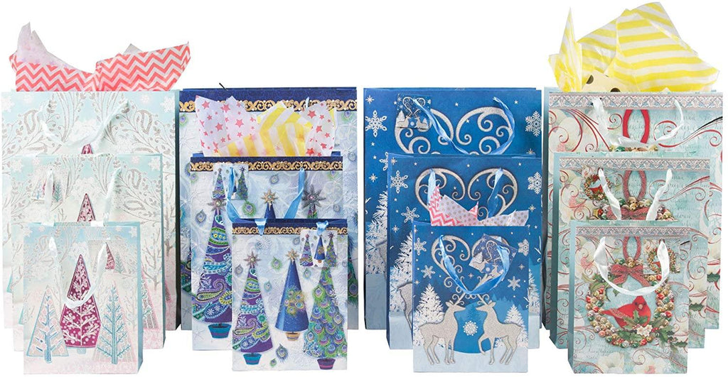 - Easy Wrapped--20 tissue paper come with 12 pack holiday gift bags. This is an easy way to warp your gifts and please forget the trouble of wrapping paper. Bring your special gifts to your beloved!