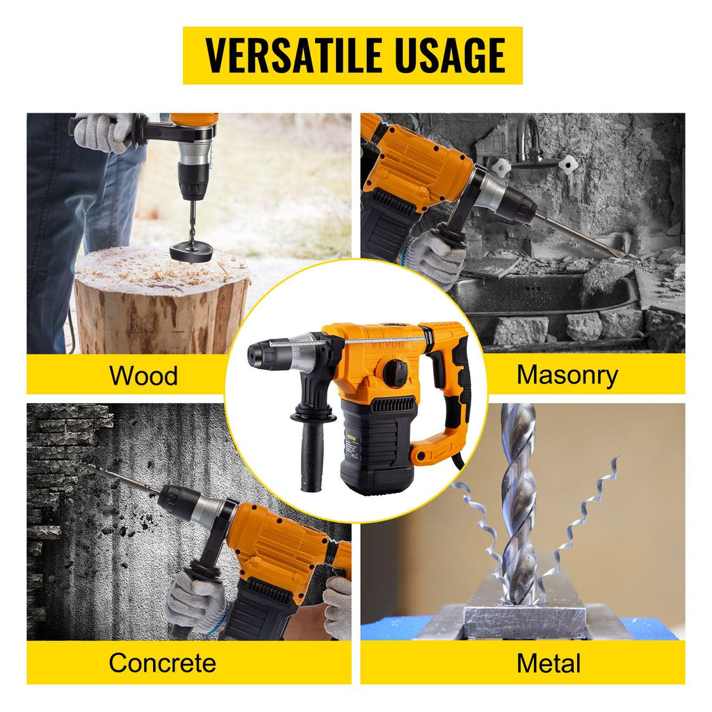 Four Functions: SDS hammer drill's four different functions: Drilling is suitable for wood, steel, etc. Chiseling is ideal for concrete or brick. In addition, hammer drilling is ideal for heavy-duty work, and chisel position adjustment adapts to various work scenarios.