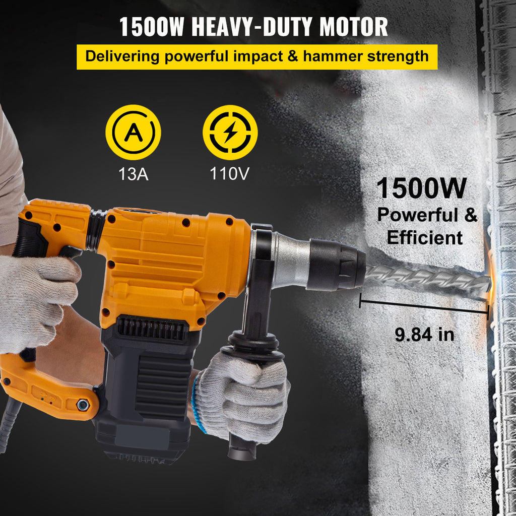 Powerful Motor: 13 amp(US) industrial motor with 5.5 feet impact energy is designed to complete heavy-duty concrete and metalworking projects. Wattage: 1500W. The drilling capacity of rotary hammer drill: 1inch for concrete, 1.6inch, 0.5inch for steel.