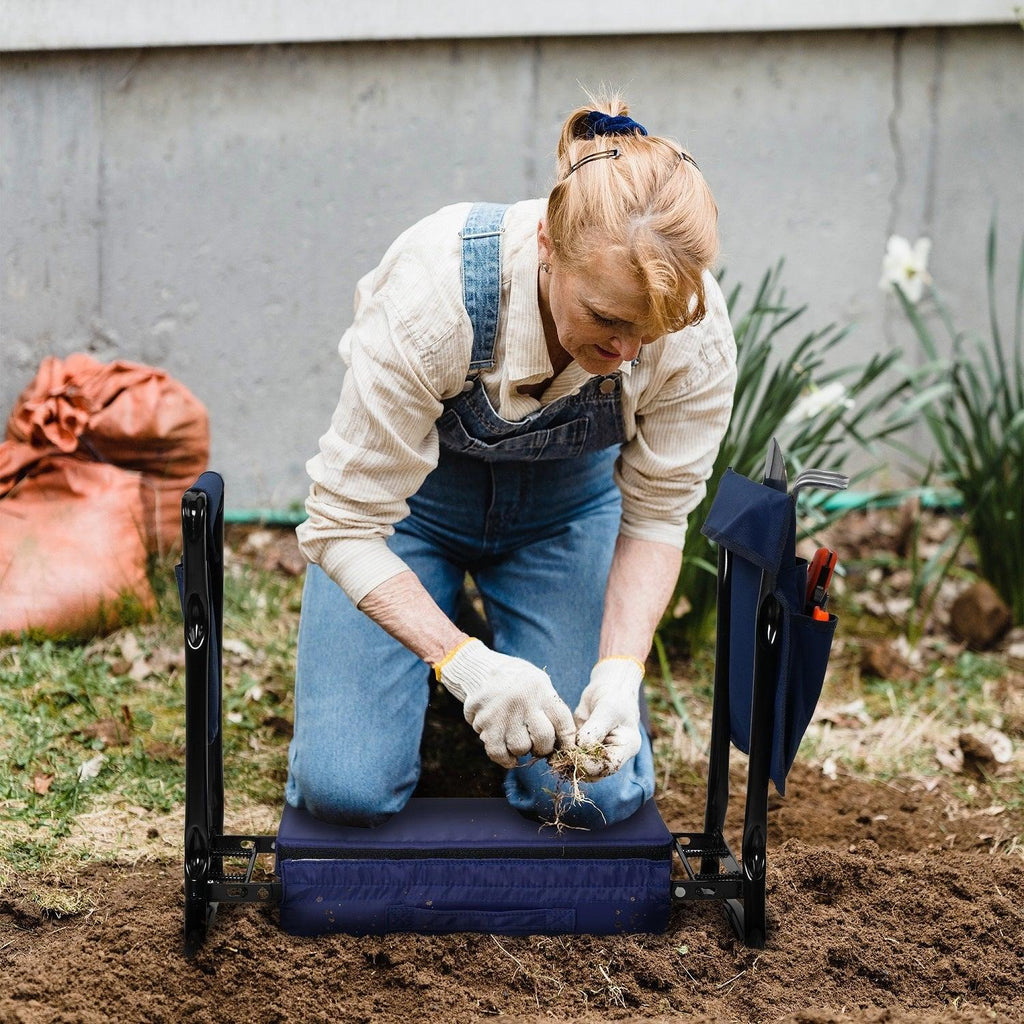 A 2-in-1 garden stool, can be both a seat and a kneeling chair, foldable and removable design allows you to easily convert directly in two functions. The removable design also makes it easy to clean and store. Made of high quality materials, it can withstand a weight of 330 pounds. With two tool pockets for easy placement of tools.