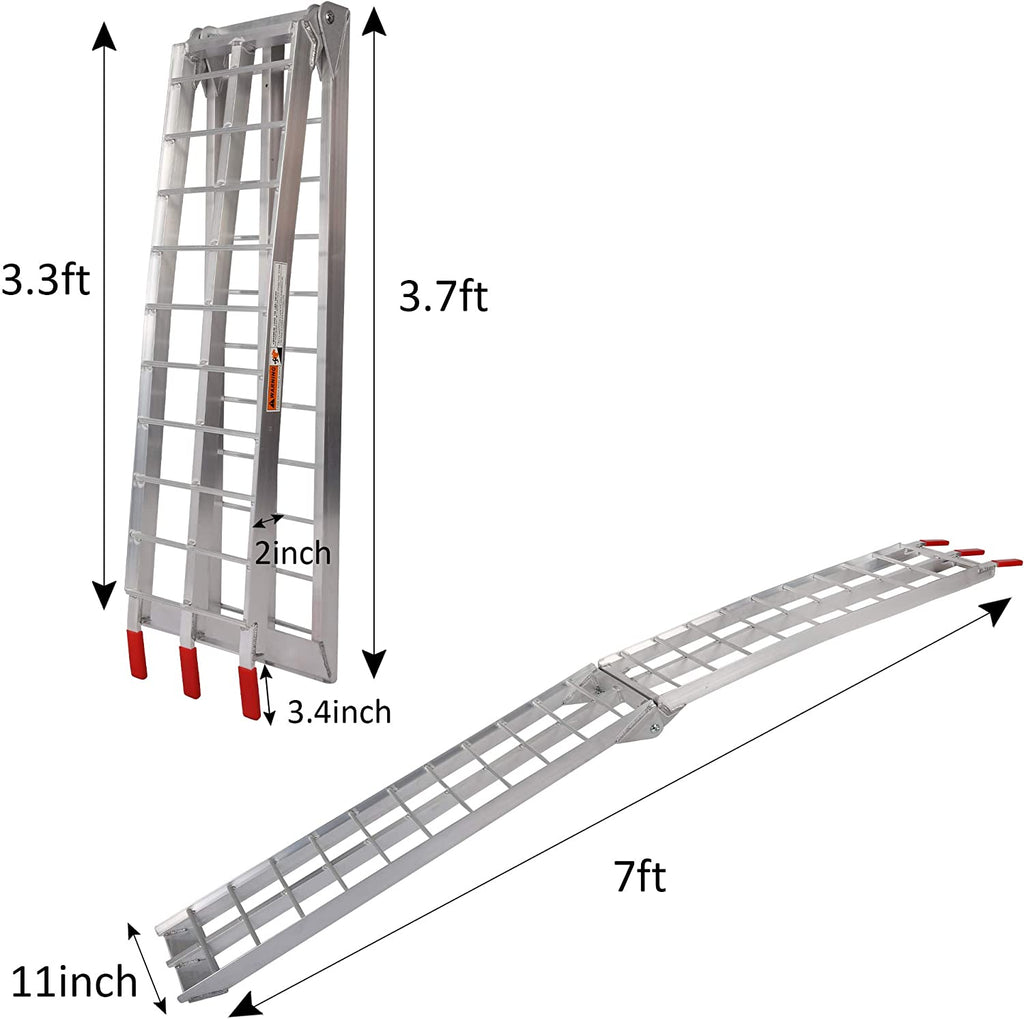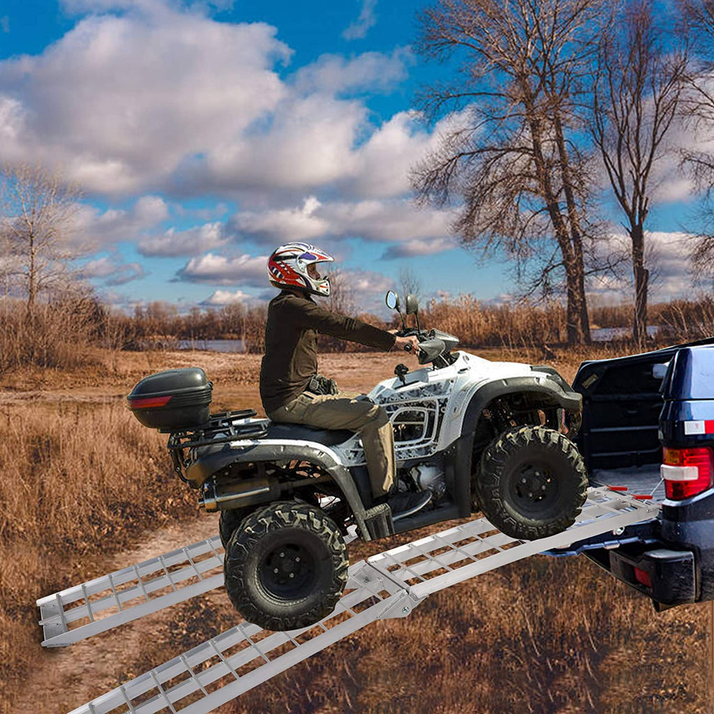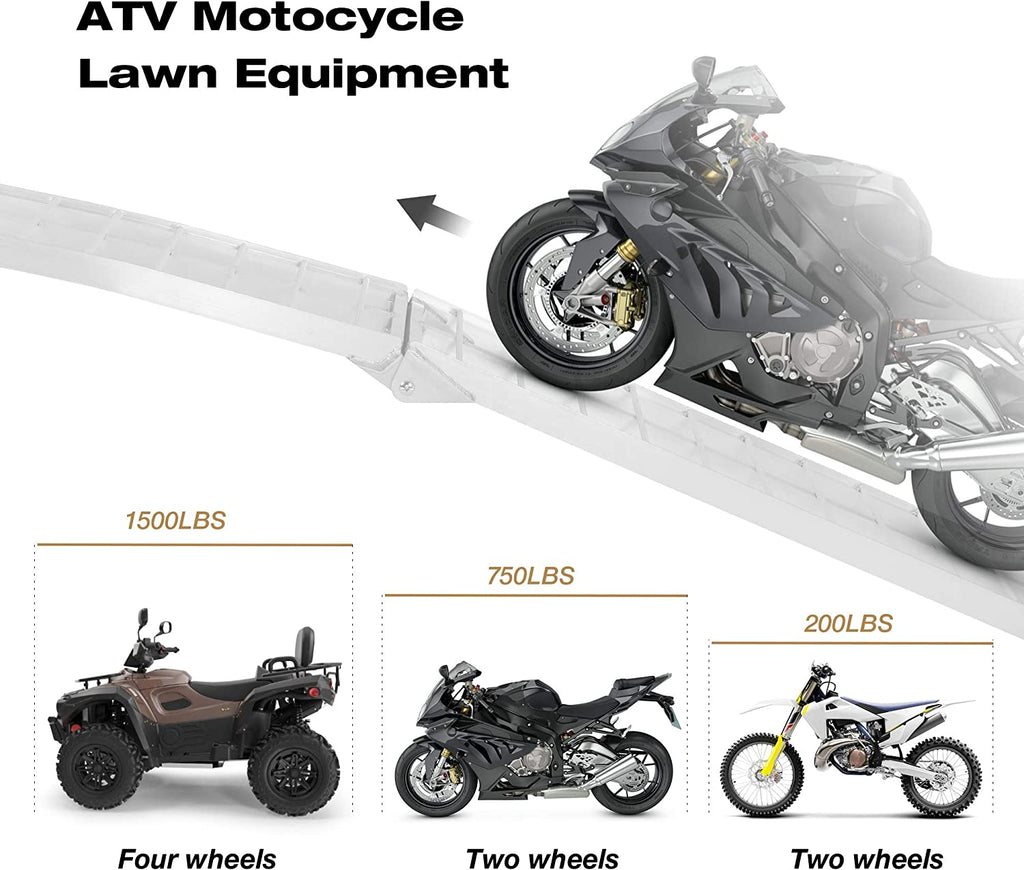 Set of 2 & 1500 LBS Capacity: Designed as a 7.5-foot-long route, loading ramps provides enough buffer distance to facilitate vehicle uphill. Max Weighing up to 1500 pounds in total, set of 2 are not only to be limited to bicycles, motorcycles, and off-road vehicles, but also to load trucks, ATVs, and trailers, etc.