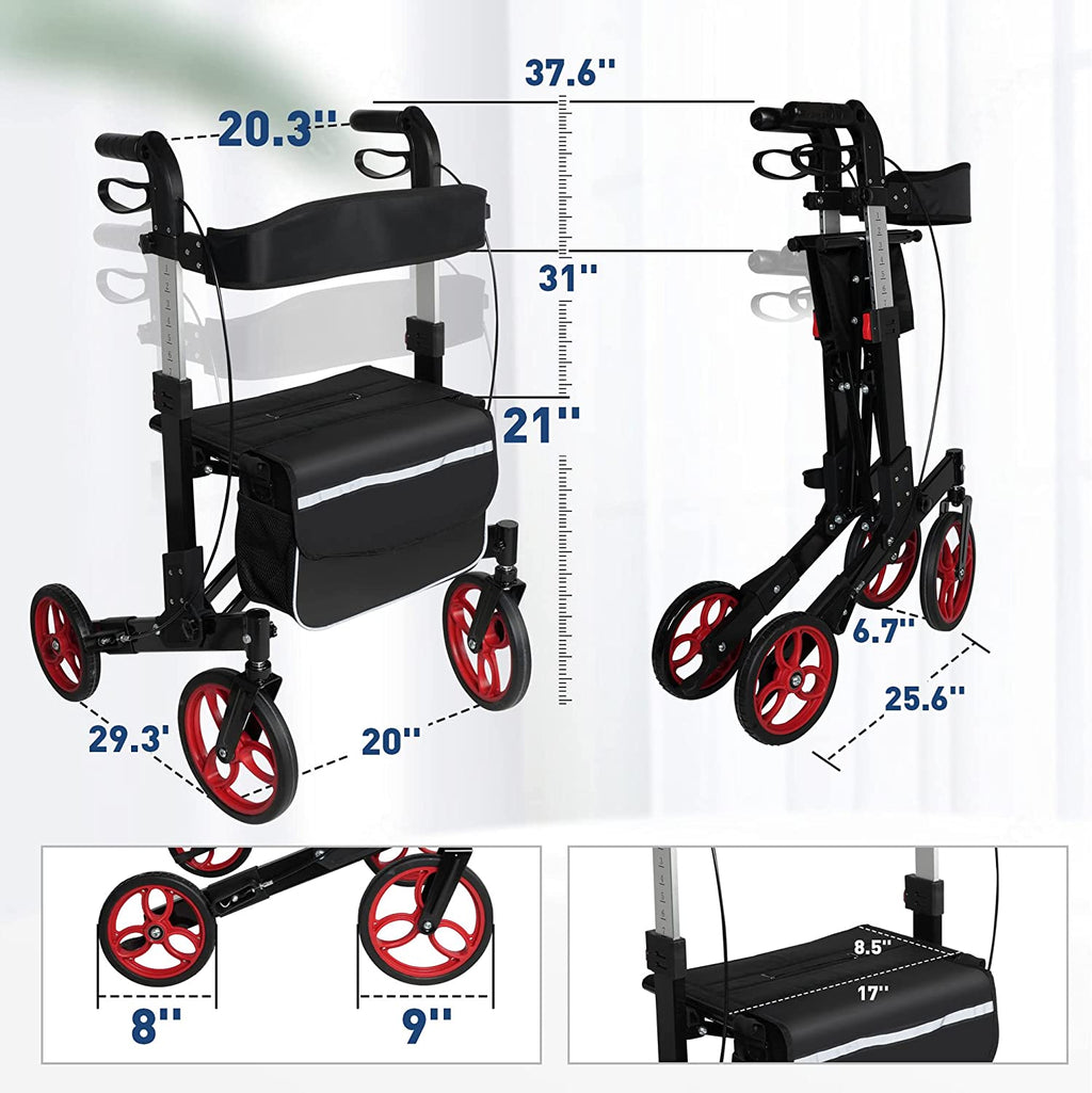 7 Levels Adjustable Height Walker: Our rollator walkers with aluminium alloy structure,features an adjustable handle(31-37.6 inches), Just press the red button under the handle, you can adjust the height of the handle with one click, whether you are 5 ft or 6 ft, you can always adjust it to suit your height and walk upright instead of hunching over.