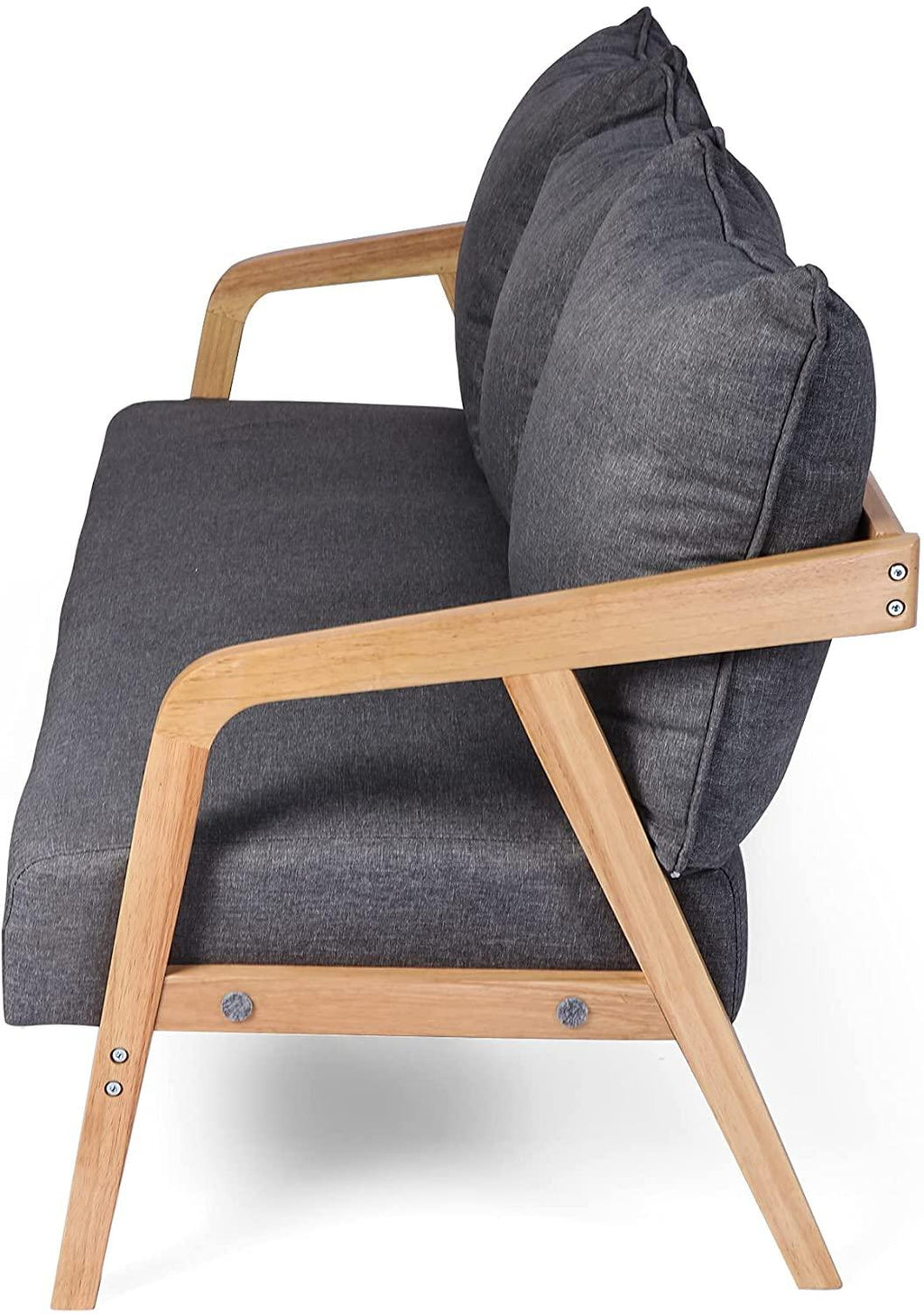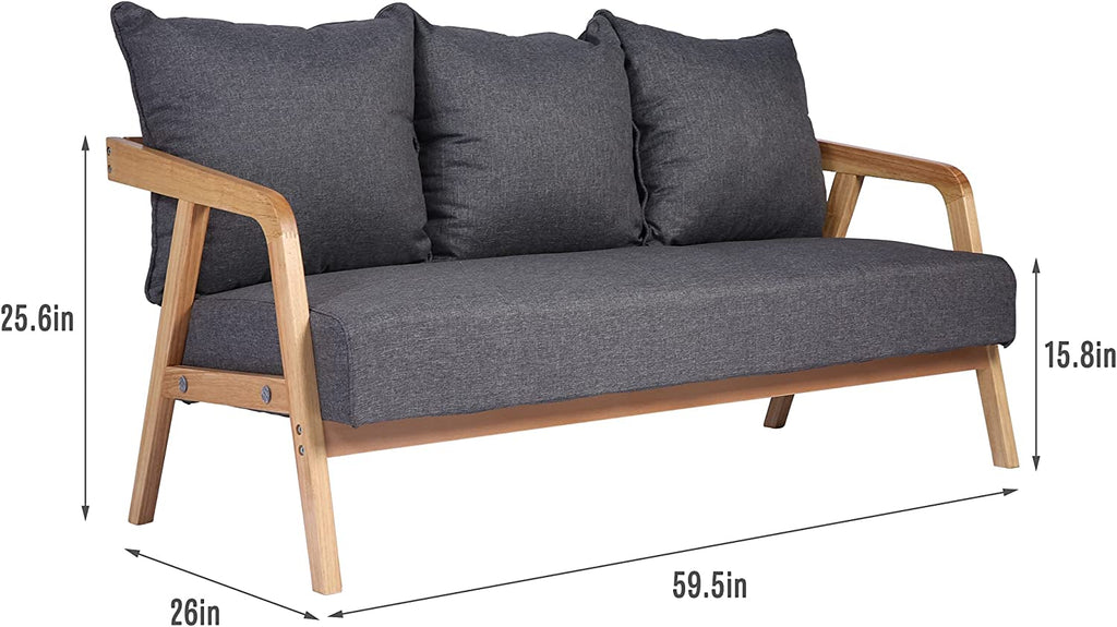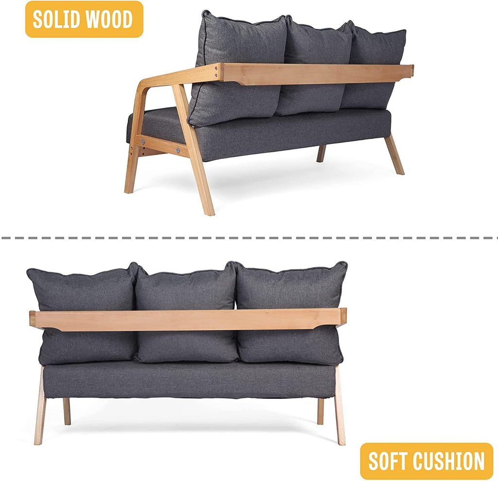 This modern and simple design 3-seat fabric is great for a variety of styles. Three super soft cushions, 26d-28d native sponge filled, rubber wood solid wood frame, walnut color handrail. The arms and legs of the sofa are designed in one piece, solid wood legs are strong and durable. Whether it's in an apartment, an office, a small space, or an outdoor recreation area. All the angles are good. Save a space. The sofa couch is simple to assemble. Easy to move. Light and firm.