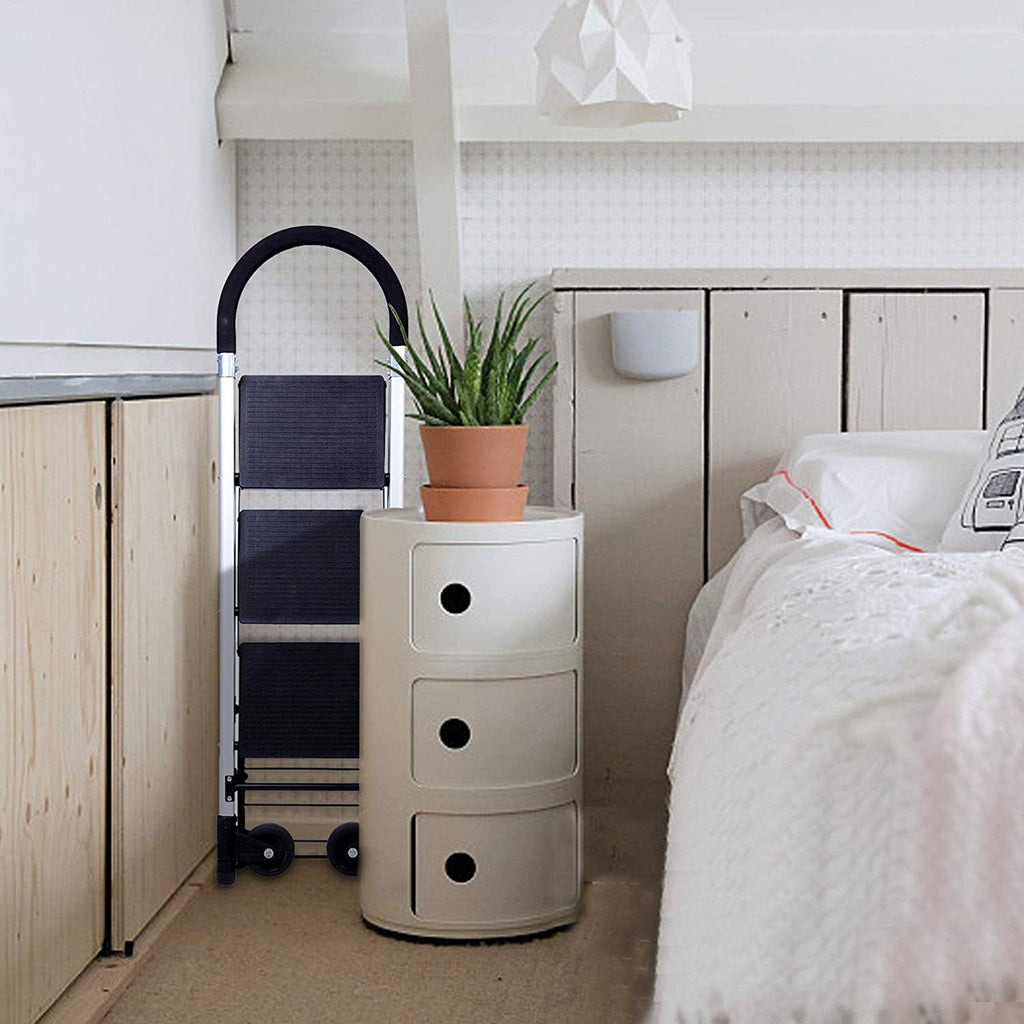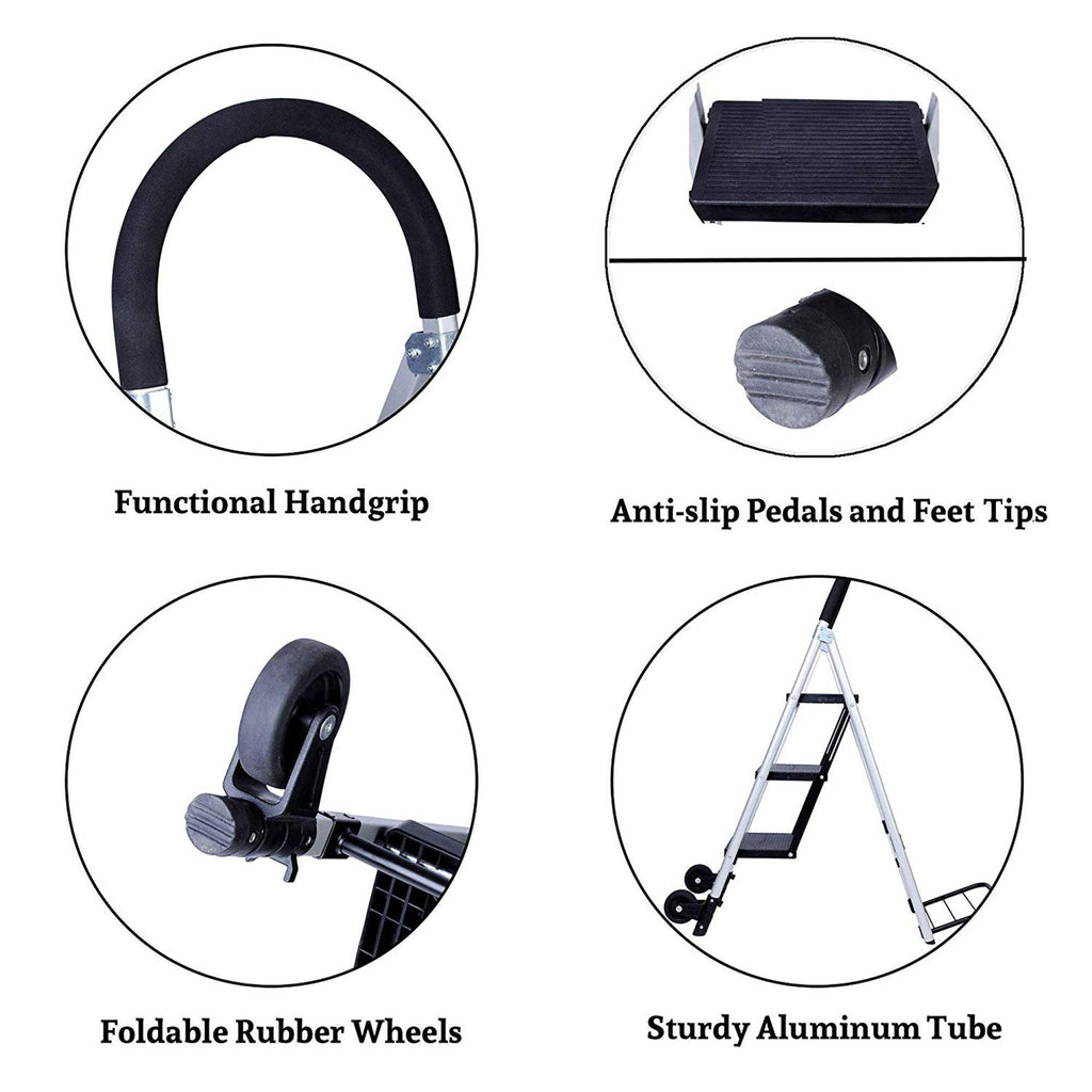 - Multi-uses:The 3-step ladder combine the functions both ladder and hand truck,it’s an ideal choice in your home,office.Whether you need the extra height for cleaning,painting,reaching up to change light bulbs or looking for better angle in photography.you can also use it to carry something lighter when shopping or help your store transport some goods.