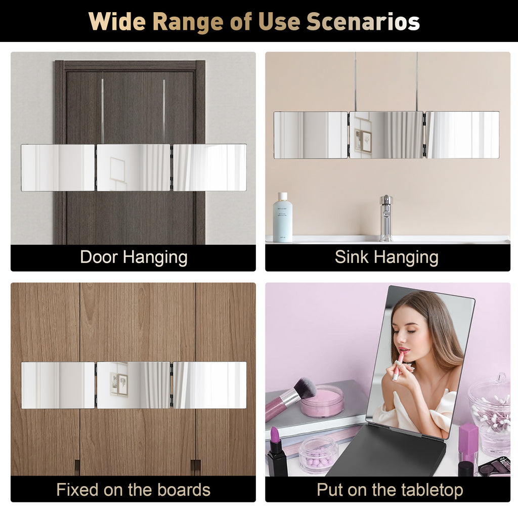 - Crafted from real glass, and featuring an ABS material outer shell, this tri-fold mirror is built to last. Its anti-collision and anti-drop design ensures long-lasting durability. Including two nails for easy wall mounting.