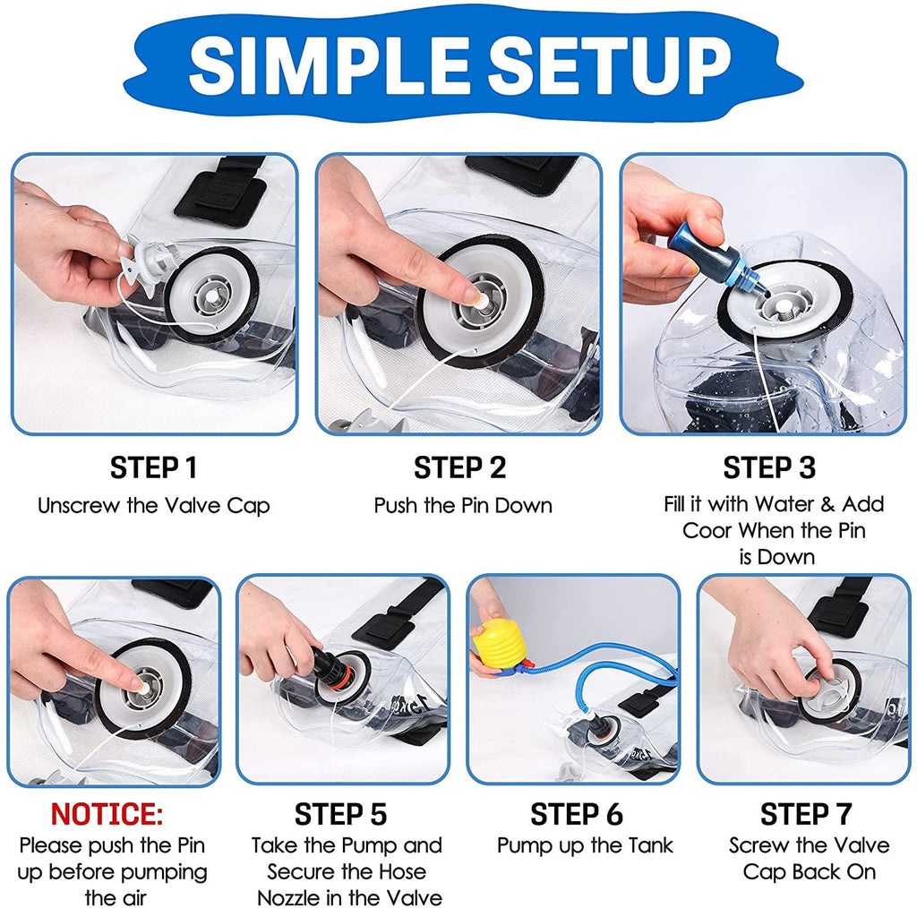 Simple Setup: Equipped with specially design with water/air valve,have it ready in minutes, push the pin once to open it up for water, hold it under the faucet until reach your desired weight, push the pin in the UP position to open it for the air, attache the pump until it is firm, heavier and more stable