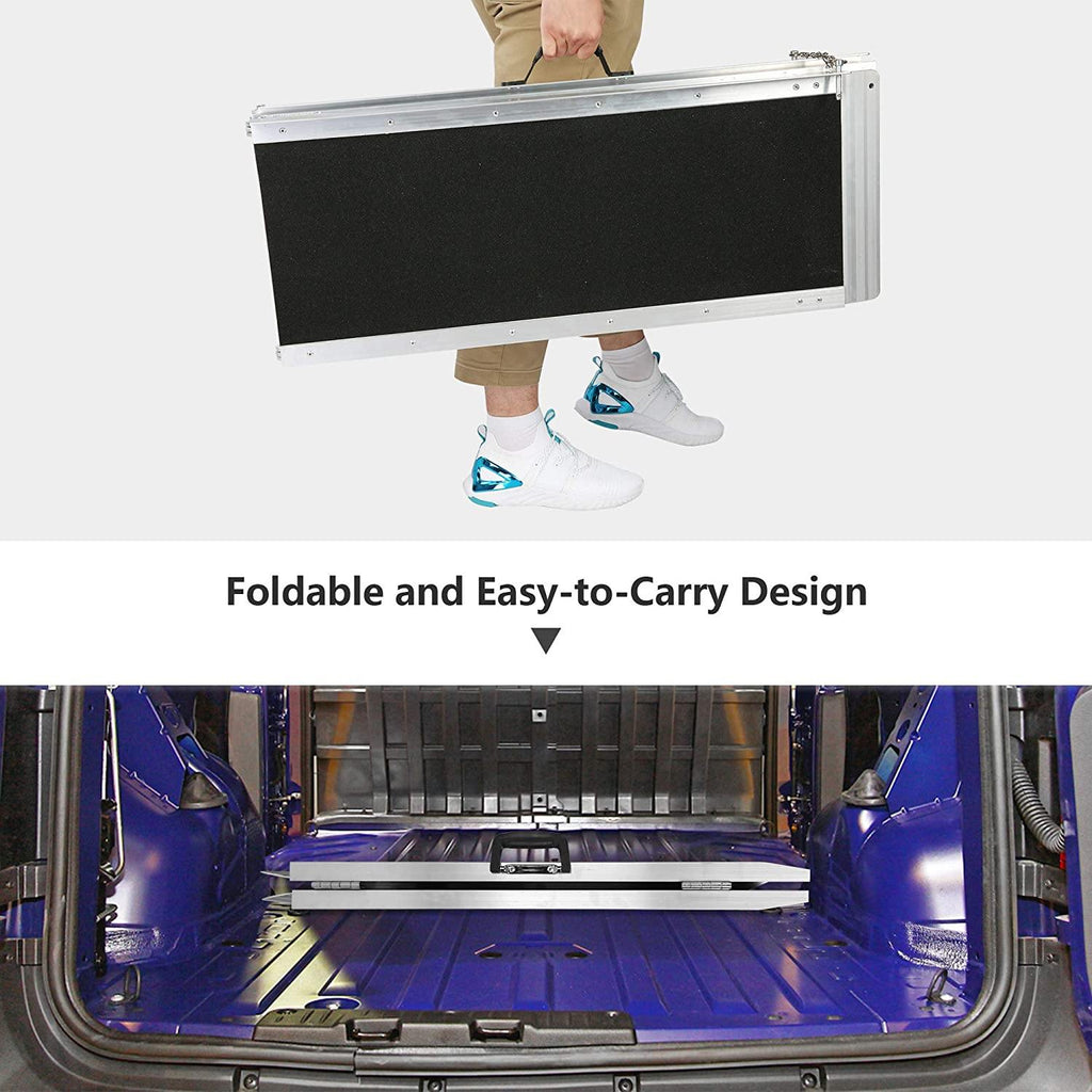 - Folding Design & Carrying Handle for Easy Storage: Designed to fo-fold, this wheelchair ramp is easy to fold up, easily fit into the back of an SUV or at home without issue; By the way, it is easy to carry with ergonomic Handles, and the peg system that holds it together once folded is simple but works.