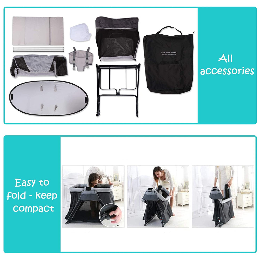Easy to Assemble, Fold & Carry: Just need to install the fabric part, which is very easy to assemble; The sturdy metal frame can be built or folded in one step; With a carrying bag, this travel crib is convenient to store and carry, a great choice for outdoor use.