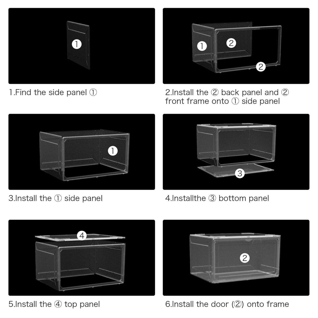 Shoe storage box is made of PET,can be recycled and odorless.The six sides of the shoes organizer are made of rigid plastic, which is environmentally friendly.Safe and strong and shatterproof.Assembly was so easy, clear instructions, no tools, simple steps. Shoe box can be stacked into any shape you want, because of bottom and top of shoe box has a stacking design,it is easy access.