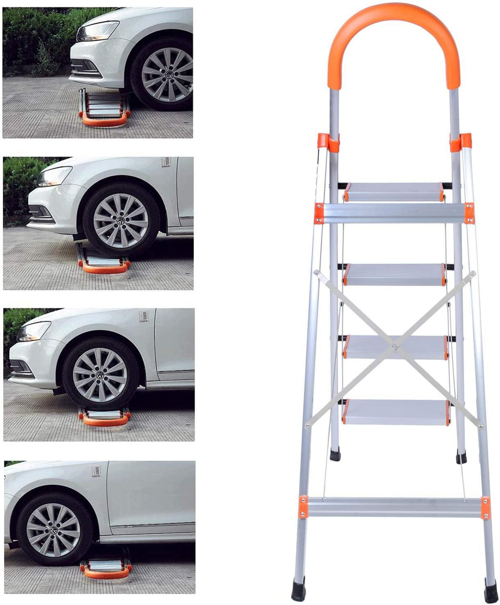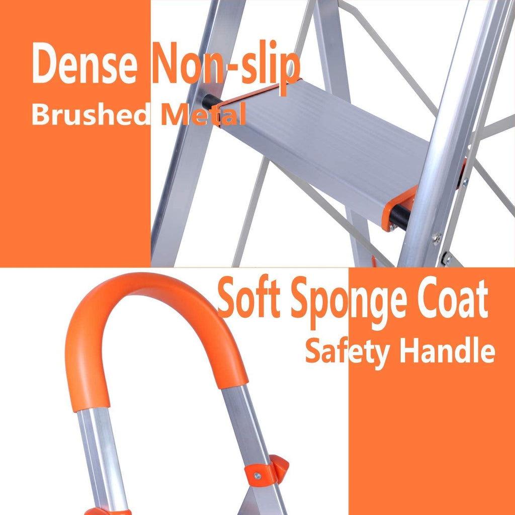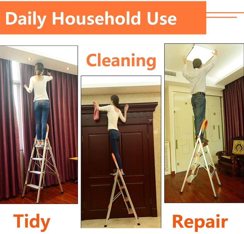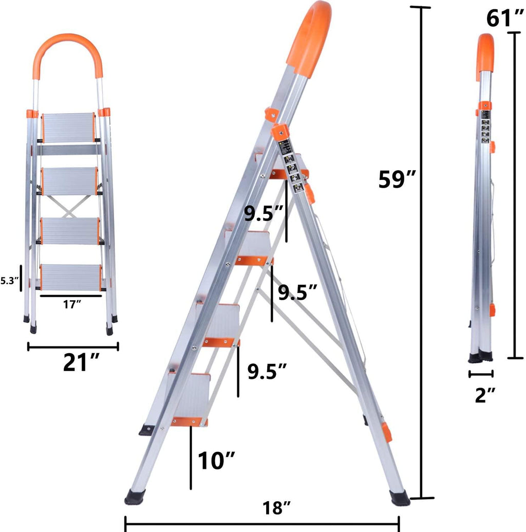 Our Bosonshop 4 Step Ladder Folding Stepladder Stool has Beautiful orange and silver color, easy to find in the house or warehouse. Large capacity for 330 pounds, good helper for daily home and office work. Non-slip foot pad and step pedal can help you reach higher places safely.