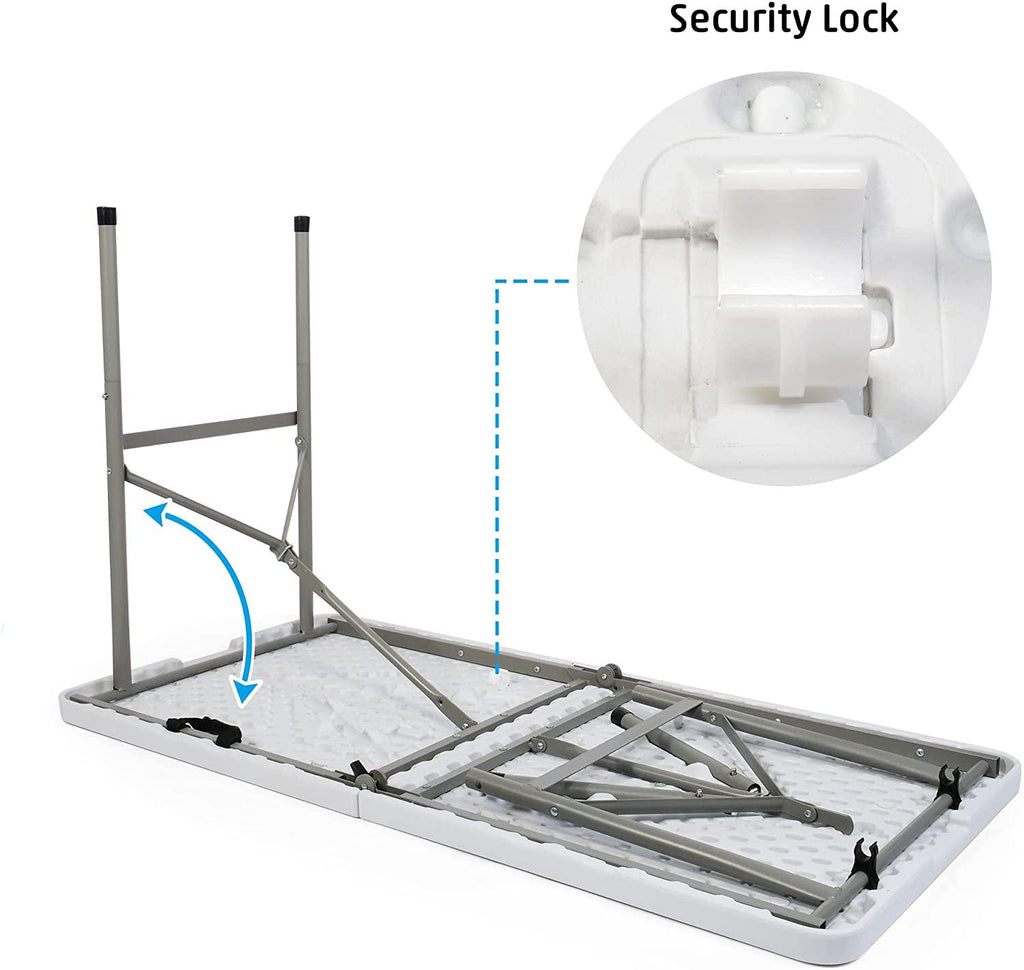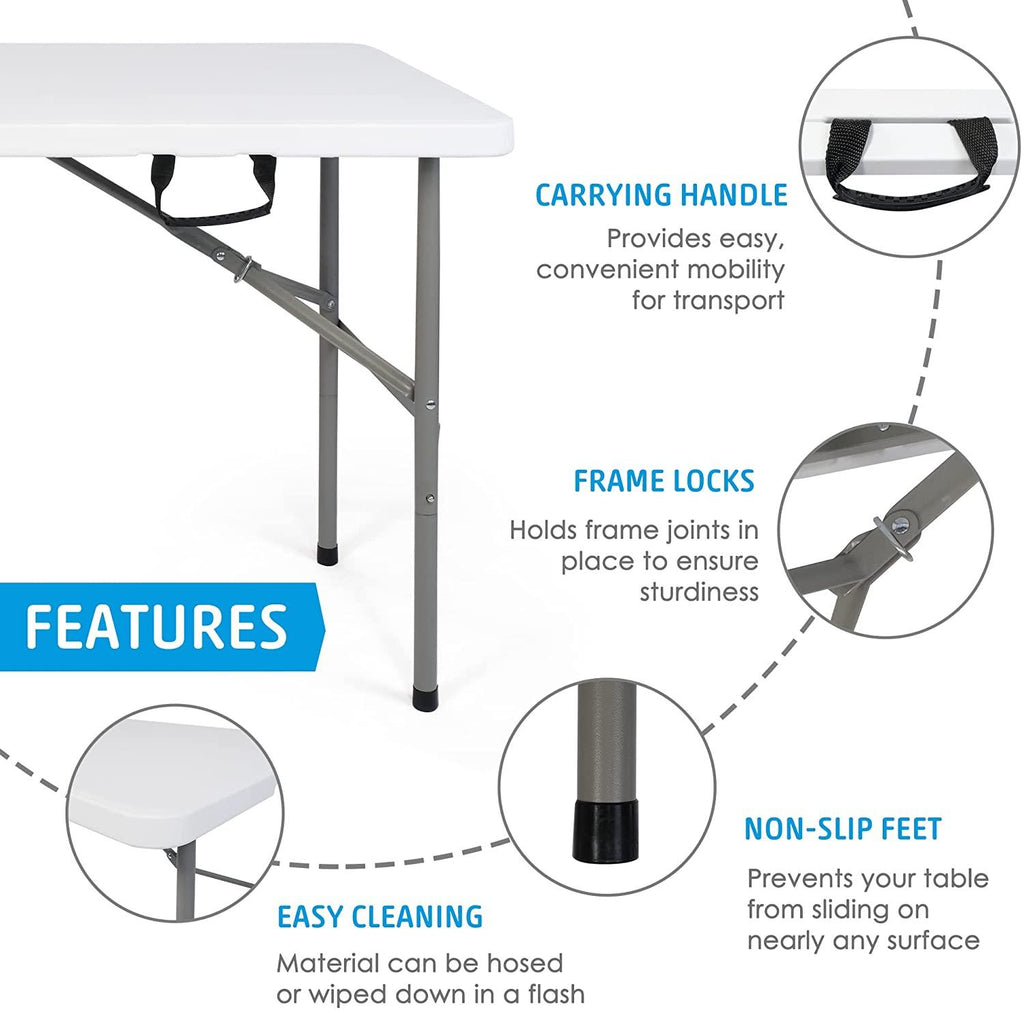 - Sturdy Construction Design: The folding table has powder coated steel legs, joint locks for the camping table frame,and non-slip rubber feet that help keep the plastic table in place during every activity.The table is sturdily constructed and UV resistant as well.