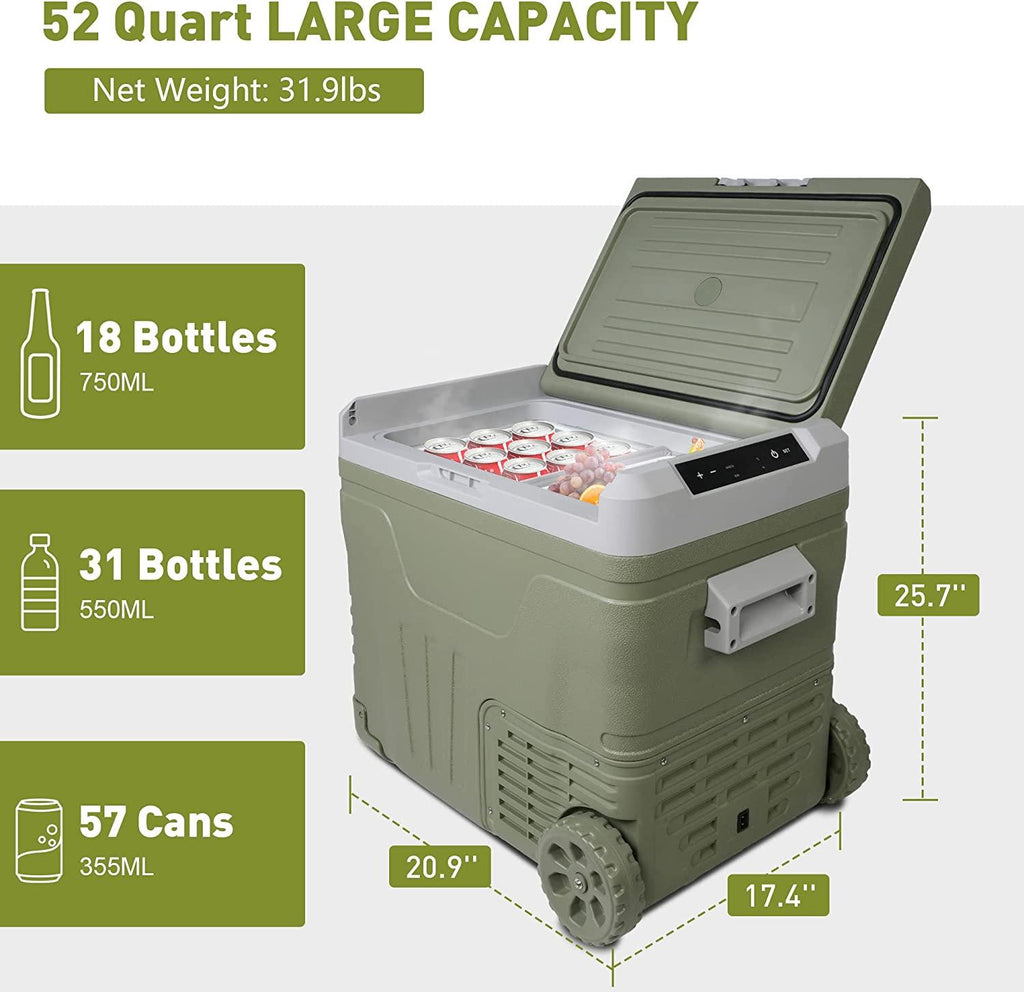 This 52 Quart Portable Car Refrigerator Freezer with Wheels & Pull Rod is an ideal choice for storing food and beverage on the go. With a temperature range from -4℉ to 68℉, HD LED display, and inverter compressor refrigeration, you can enjoy precise temperature control and energy-saving efficiency. It is compatible with 12/24V DC & 100-240V AC.
