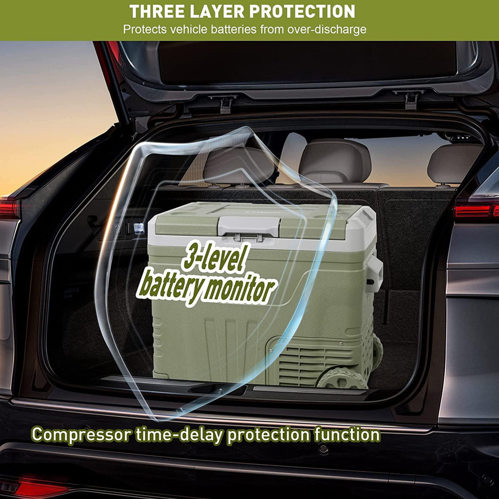 Home/Car Use & Battery Protection System: 12v car fridge comes with 100-240v (by AC/DC adapter) and DC 12V/24V (by car cigarette lighter) for home or various vehicles such as SUV, truck, RV, etc. The refrigerator offers three different levels of battery protection (H/M/L) and compressor delay protection to prevent over-discharging of the vehicle battery, and the cooler will automatically shut down once the supply voltage falls below a set level.
