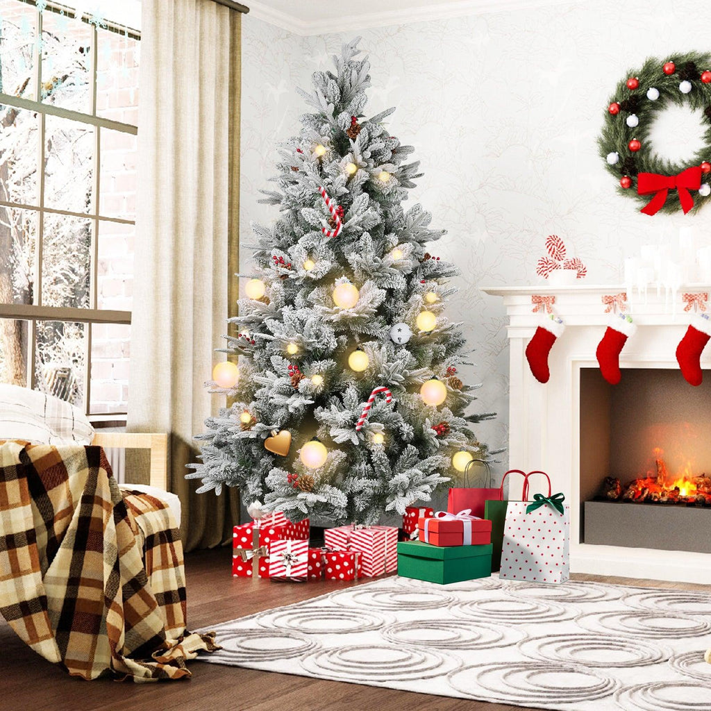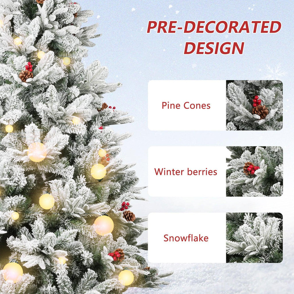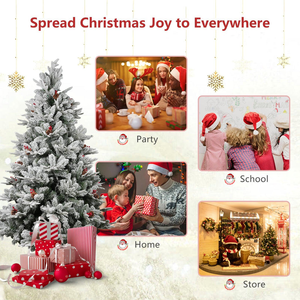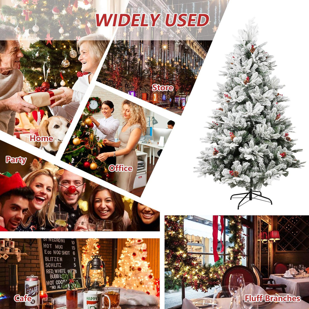 Crafted with care and attention to detail, our artificial Christmas tree features a realistic snow-flocked design that gives off an enchanting snowy appearance. The beautiful white snowflakes delicately cover the branches, creating a winter landscape that captures the spirit of the season. To enhance the natural charm, we've added hinged branches, pine cones, and red berries, providing a touch of elegance and sophistication to your Xmas decor.