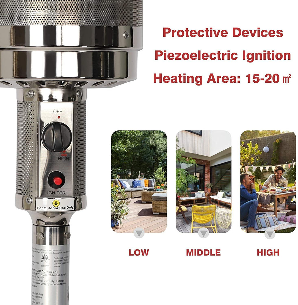 Triple Protection System: Our patio heaters for outdoor use are CE and ETL certified, built-in flameout protection, hypoxia protection and dumping protection. The heater will automatically shut off if the unit accidentally tip-over. Always keep you and your family safe.