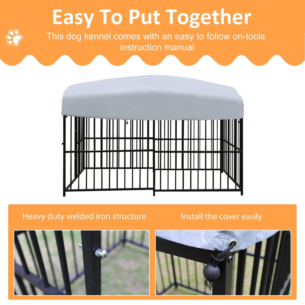 RAIN AND UV RESISTANT ROOF COVER: Our outdoor dog kennel comes with a removable ripstop cover made of high-quality 210D polyester fabric, which protects your dog from rain, dust, UV rays, and less snow, protecting your dog from sun and rain.