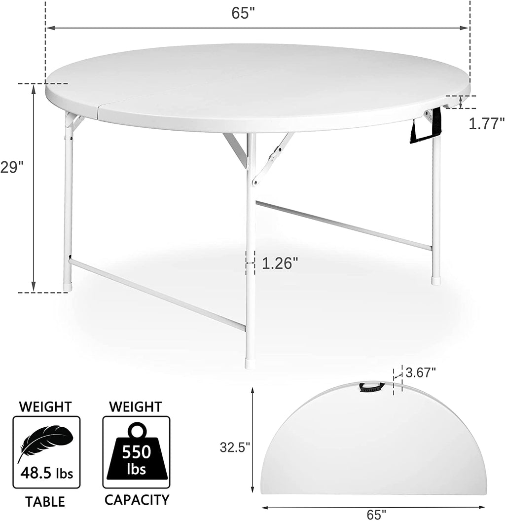 Bosonshop Folding tables and chairs are a hassle-free way to accommodate your guests. They’re incredibly strong and can hold up to 800 lbs. More space means more room to play! At 65" diameter, our super-size tabletop accommodates dinner plates, game boards and everything else you need for an unforgettable night. Great for holiday dinners, card games or backyard BBQ, guests will love this party table and chairs. The collapsible, space-saving design makes our set a convenient fit for tight spaces, while its portability means you’ll use it anytime, anywhere.