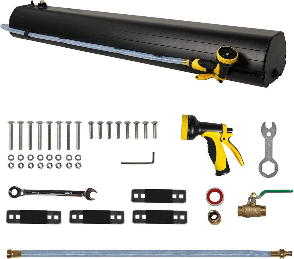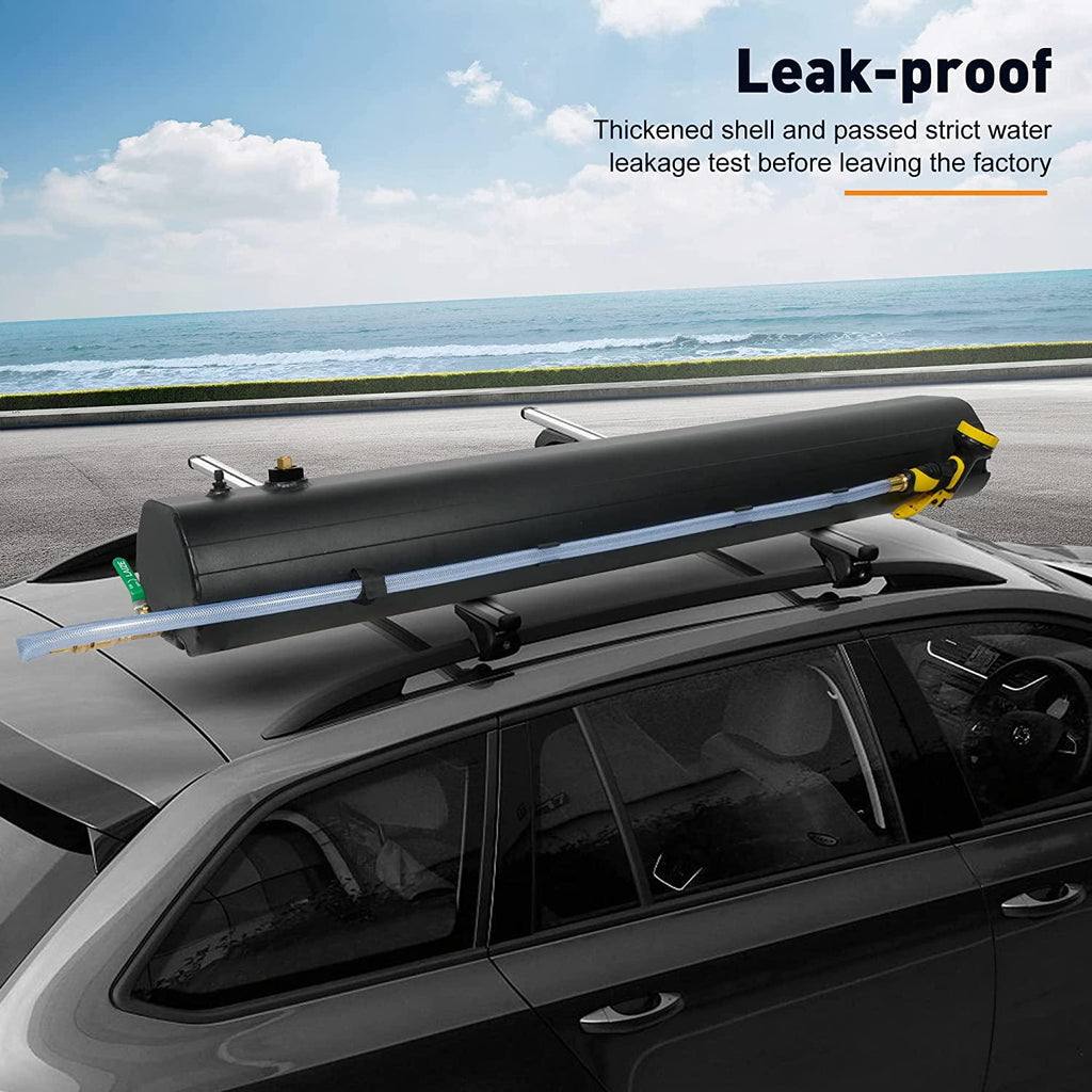 Premium Material: This water tank is designed with high-strength welded aluminum and magnesium alloys, brass accessories, and black powder coating, which can better absorb sunlight.. Pressurized water tank could be warmed up well under hot sunny weather, so take good caution with testing the water before use, plus maybe avoid skin contact with the tank itself. And the thickened water tank shell and strict leak proof testing make it won’t leak water.