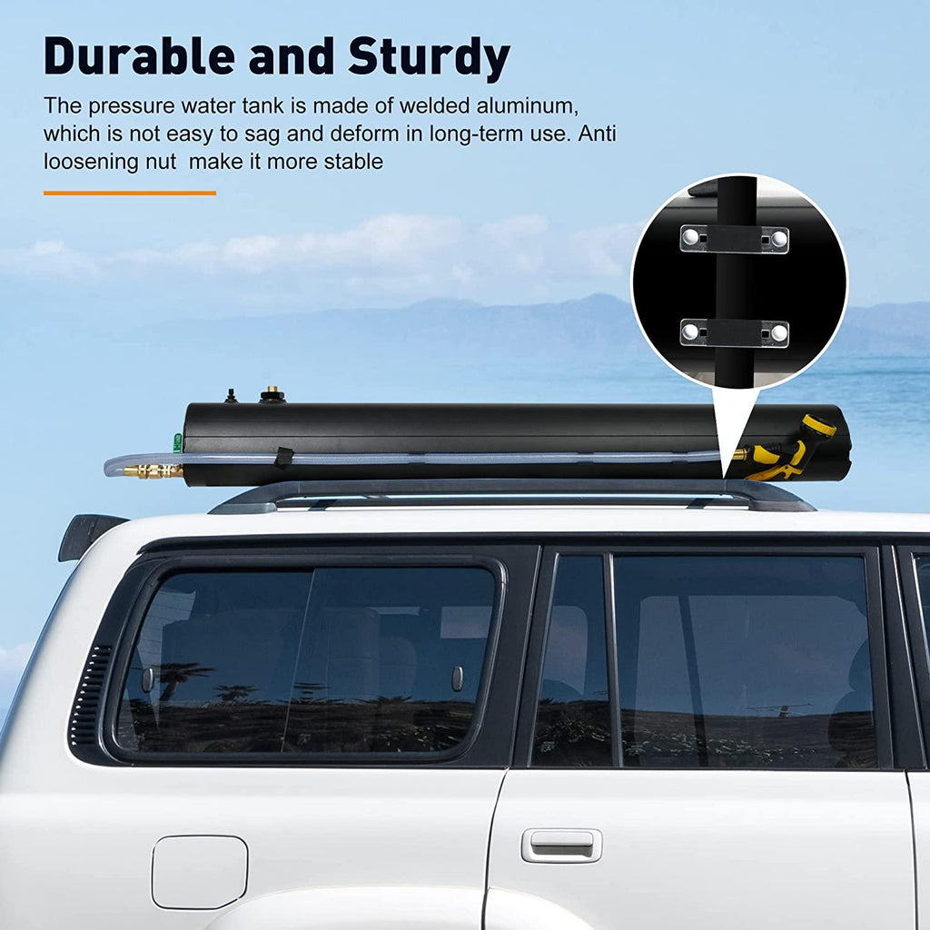 ATTENTION: The pressurized camping shower water tank delivers 30L (8 gal), please consider its weight before buying a pressurized water tank, plan to have a roof rack that can support 8 gallons (about 67 lbs), plus another 30 lbs for a safe 100 lbs (this is just static)