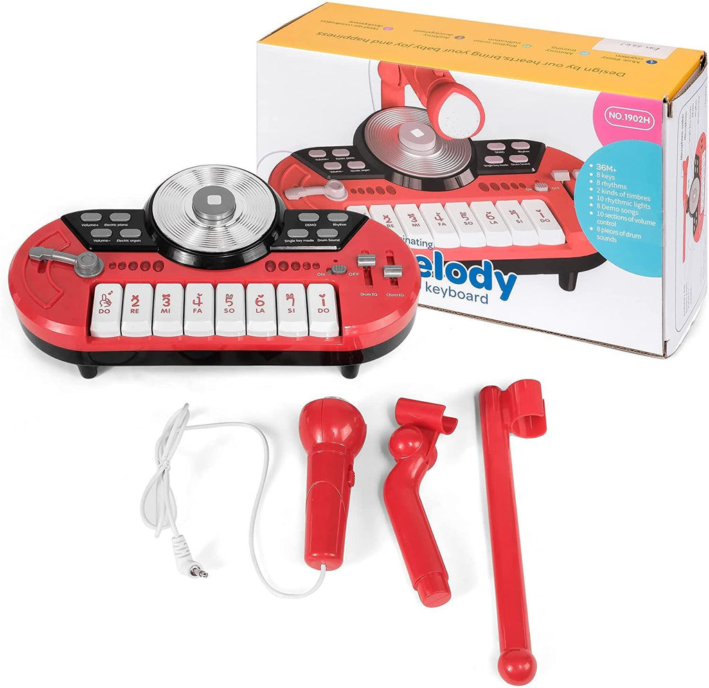 - Multifunctional Toy Piano for Kids: 8 keys, 8 rhythm, 2 kinds of timbres,10 rhythmic lights, 8 demo songs, 10 sections of volume control, 8 pieces of drum sounds, volume adjustment, DJ lever, equipped with microphone.