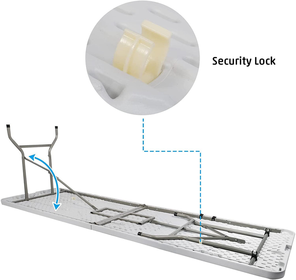 Foldable & Portable: No assembly required. This 8 foot folding table folds in the center, locks closed, and is compact and easy to store. Comes with a comfortable carry handle for better portability.