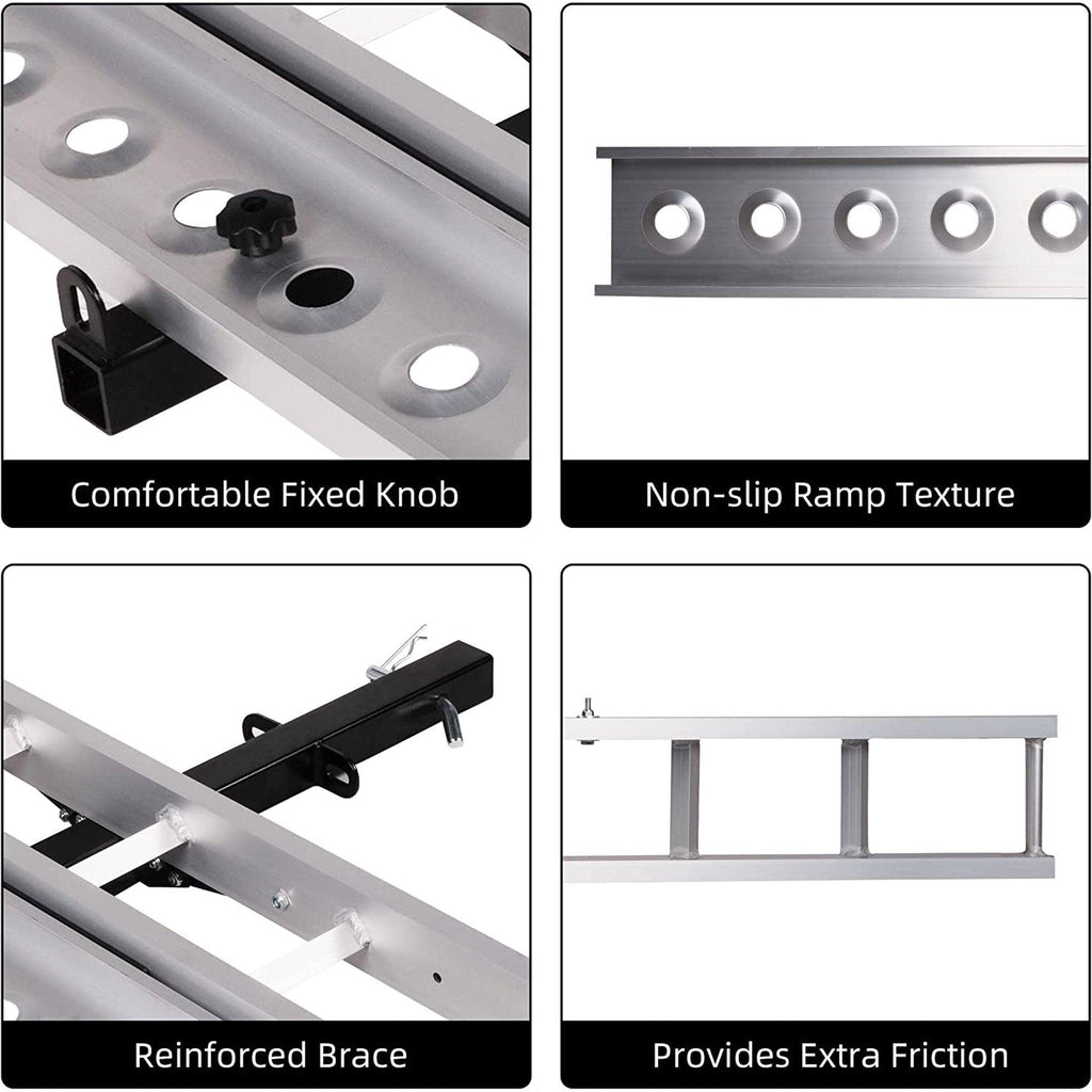 Durable Build: Our motorcycle hitch carrier chock has a heavy-duty aluminum upper frame and steel reinforced lower brackets with 440 lbs load capacity, enough to carry dirt bikes, scooters and off-road vehicles.