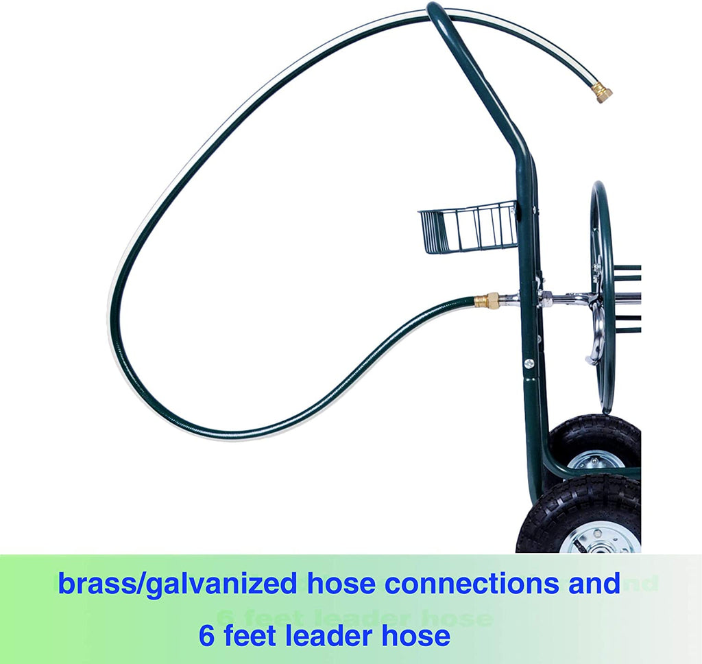 Four 10 inch Pneumatic Tires: The 10 inch rubber wheels are sturdy & pneumatic, which allow you to steer the Hose Reel Cart in various types of terrain.