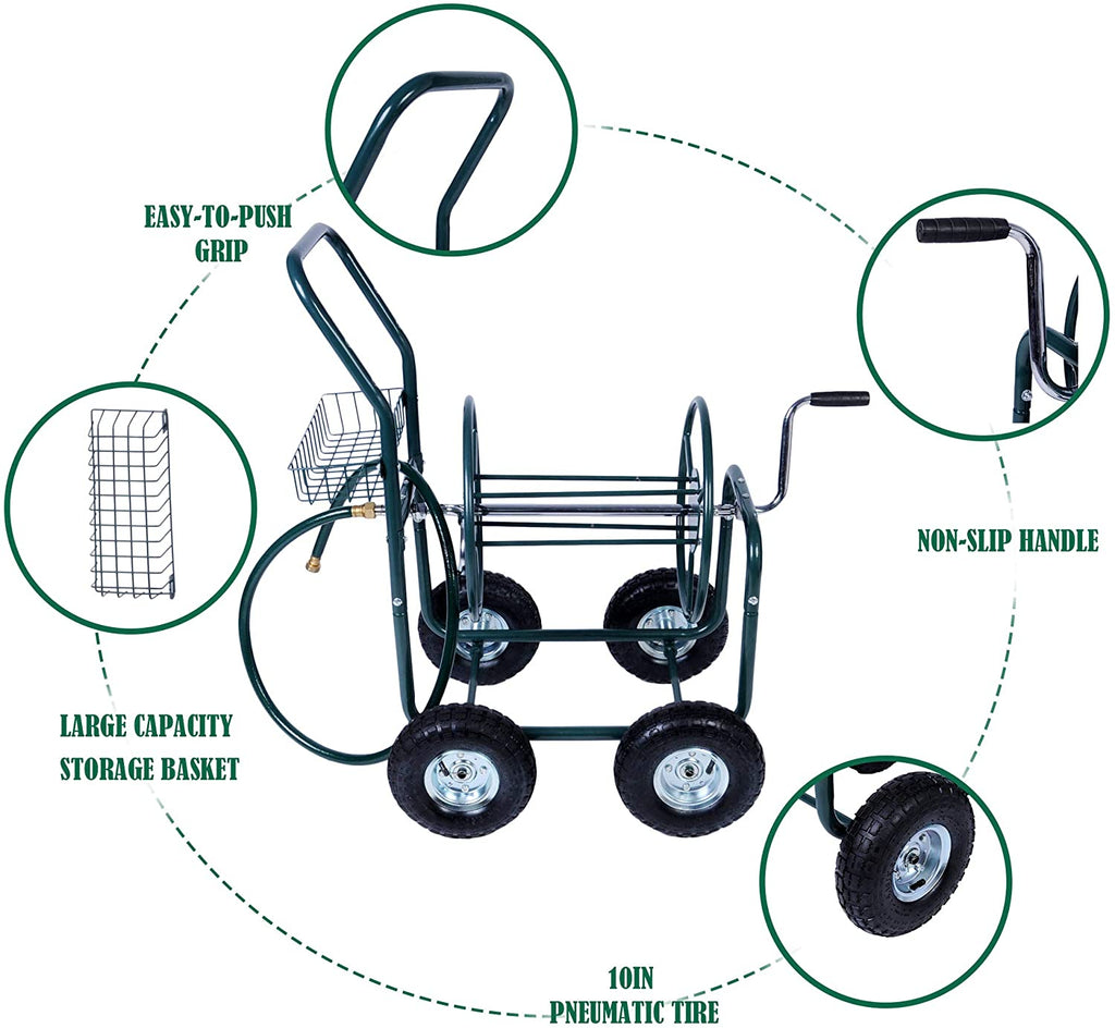 Garden Hose Reel Cart will be a good helper for your gardening task. Our Hose Reel Cart can hold 230 feet of 5/8-inch or 390 ft 1/2-inch hose,let your water pipe get well organized. Constructed with 4 wheels, so you don’t need to drag heavy water hose to watering your lawn anymore.After watering,just turn the handle and it will hold the hose perfectly. Weather resistant powder coat finish increased the service life of the cart.