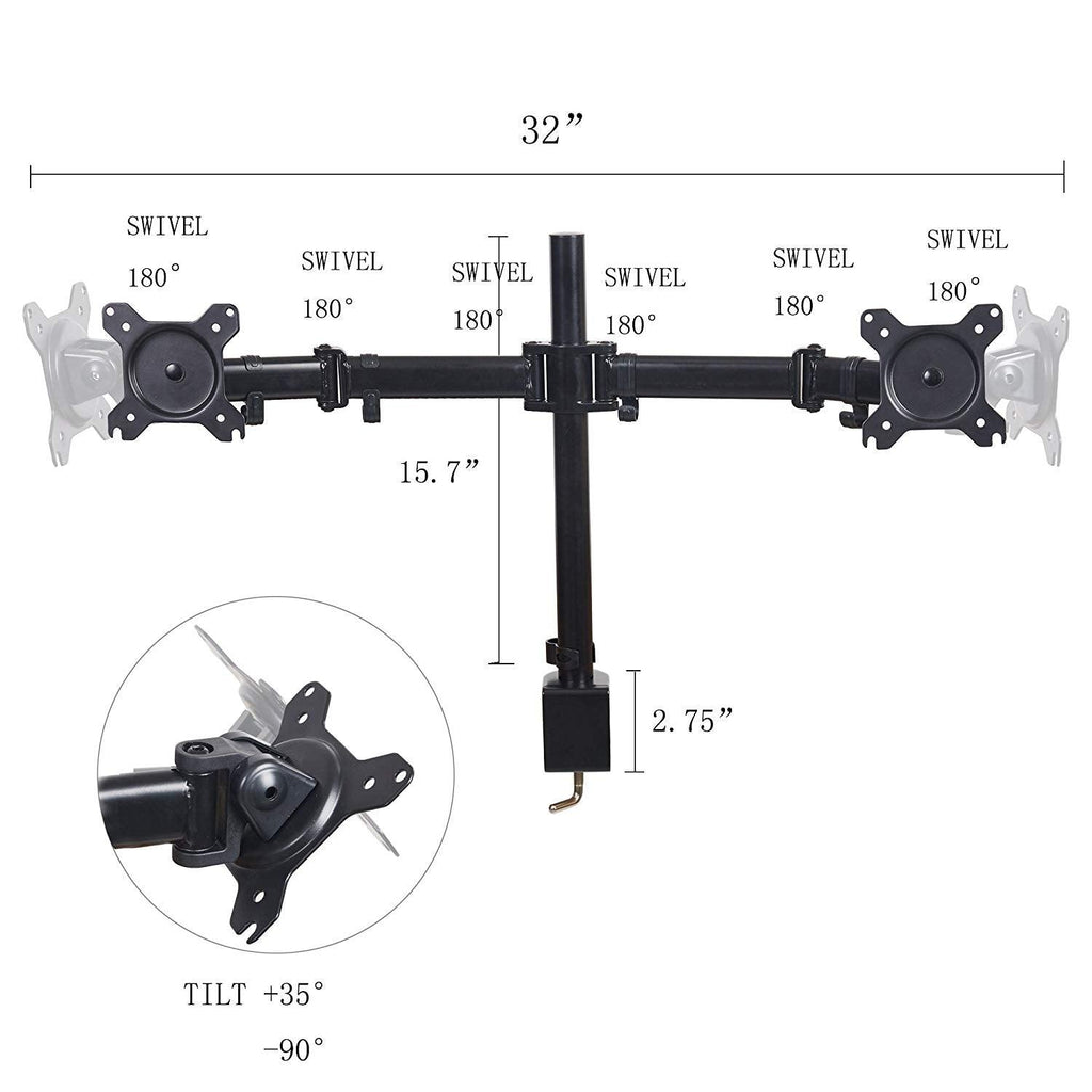 Each arm mount universal fits and compatibility for monitor from 13 to 27 in; Heavy-duty stand rated for flat screens up to 17.6lbs; VESA compatible 100 x 100mm and 75 x 75mm