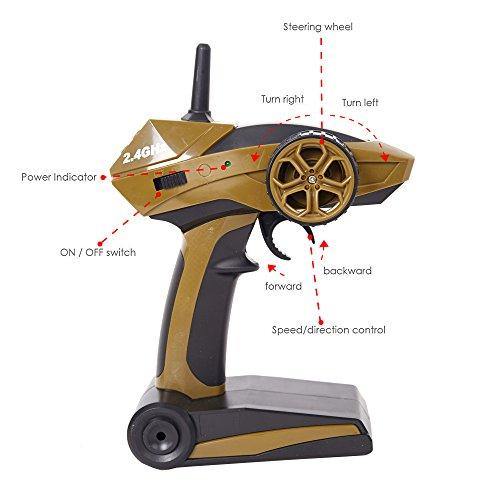 Hi-q rubber wheel anti-skid 4 wheel drive 2.4 GHz radio control and articulated front and rear suspension.