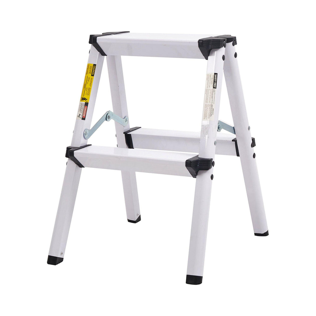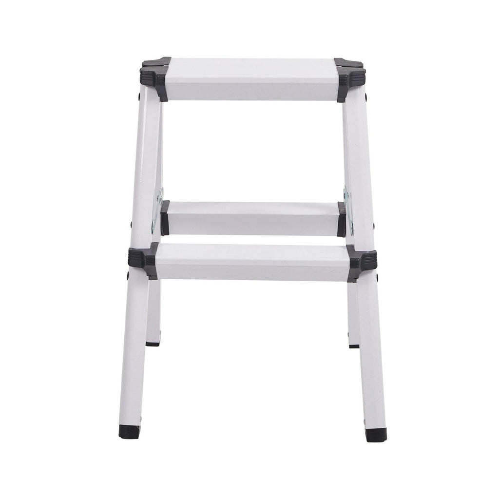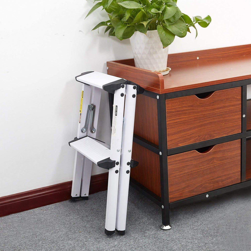 Durable aluminum alloy frame. Feature slip-resistant steps for added safety. With an top platform for long standing comfort. The non-slip angled feet helps keep ladder firmly in place. No assembly required for easy using. Foldable for saving storage and transport. Ideal for house, office,good helper to reach up a certain height.
