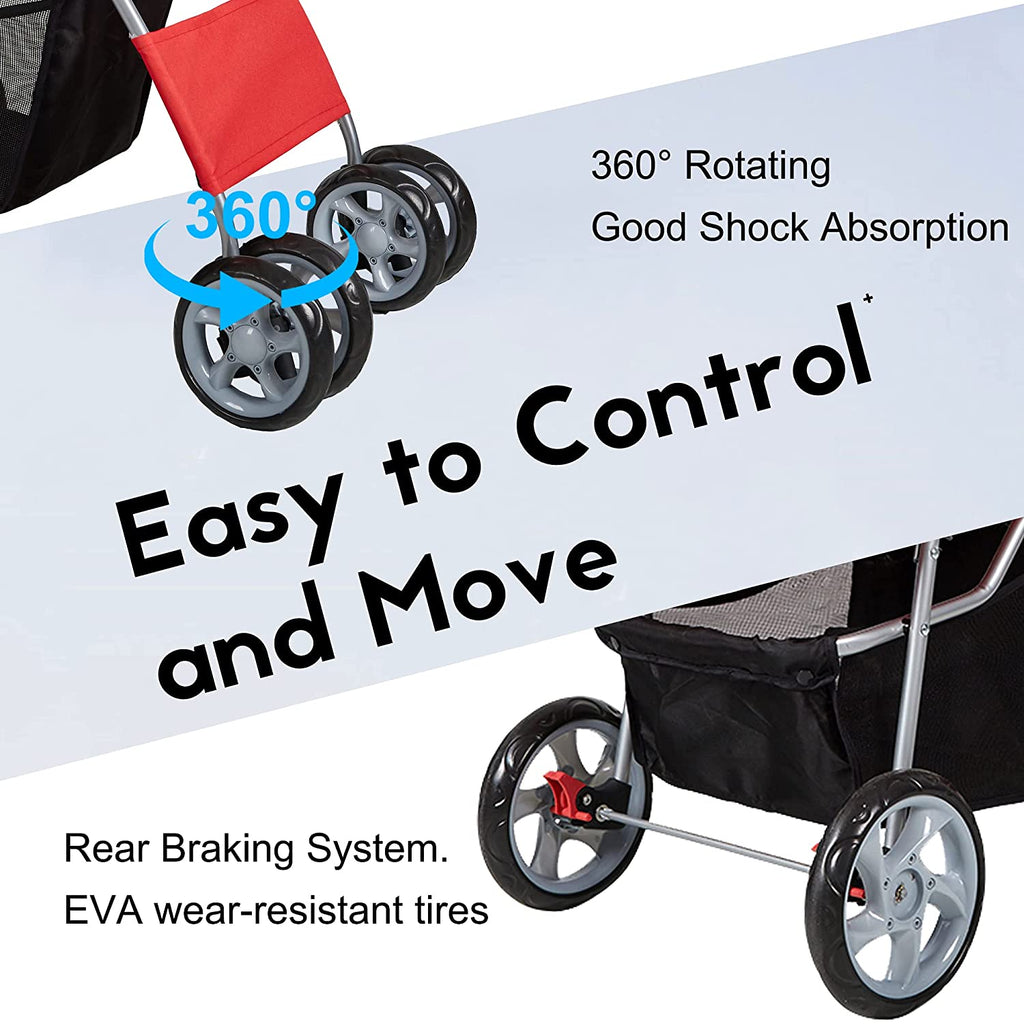 Our pet cart has two front wheels which can be rotated 360 degrees, the rear wheel with brake, let this durable 4-wheeled stroller make for a safe and smooth ride whether you are taking a quick stroll around the block or a jog through the park.