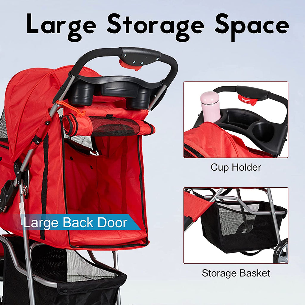 Extra space: Storage basket and Cup holders: it can store other pet supplies, such as pet food, also can store small items that we go a walk, such as snacks, water glasses, umbrellas, clothing, etc.