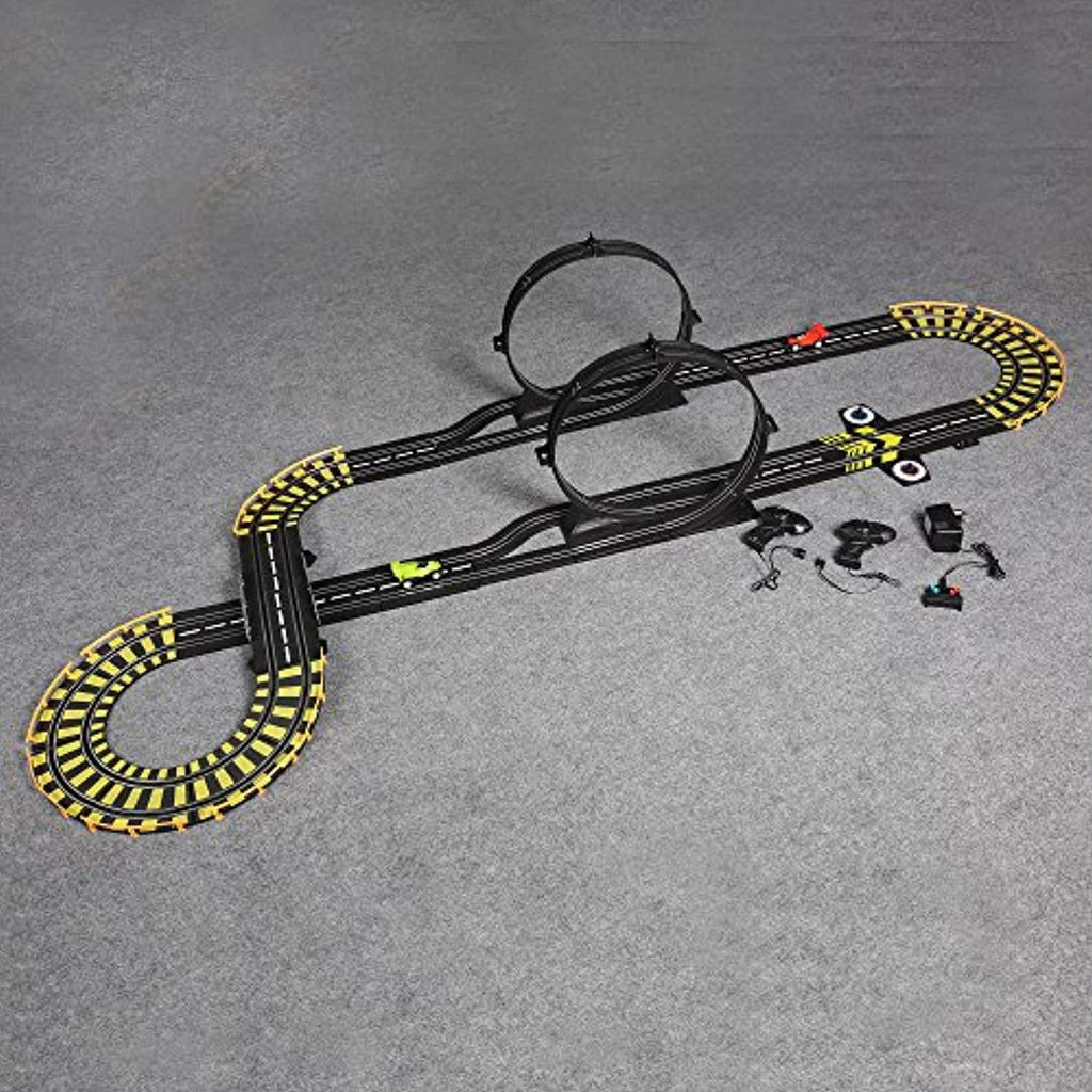 Enjoy fast-paced car racing action on nearly 23 feet of track with realistic cars that reach scale speeds of 350 mph