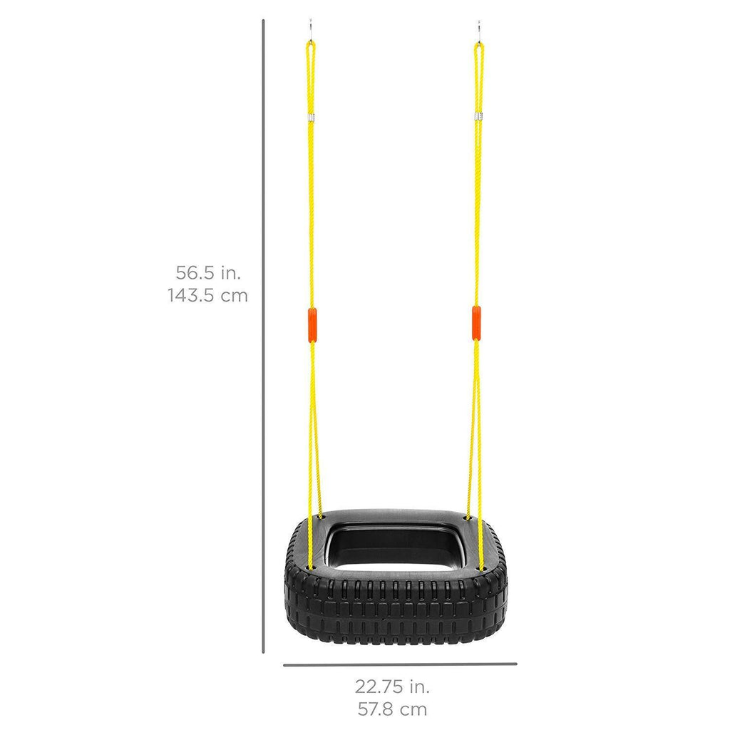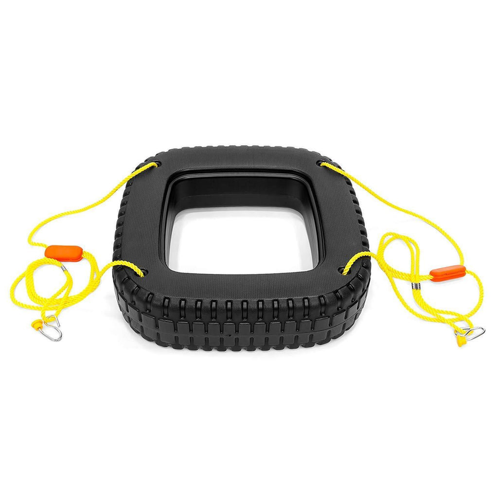 - The swing in tire shape not only to attract the eyes of customer, but also this shape designing can hold kids more safely. As you can see the width of the part kids sit is much wider than other shape. Besides, it has a hole in center can hold the kids bottom down and the body up.