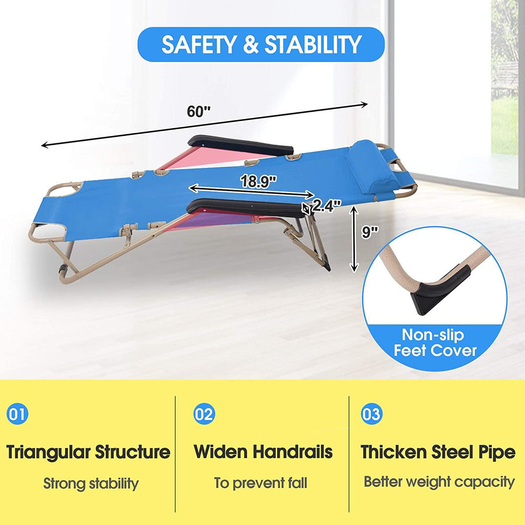 Functional as reclining chair or sleeping cot. Ideal for anywhere you like, home use in living room, yard, deck or lawn, outdoor use for camping, pool, beach or even in office to take a break.