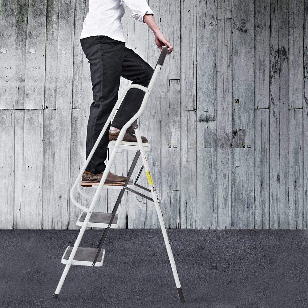 The first step is about 81/2 inch from ground, second step about 9 inches from first. The description says there is also a tray. There is no trap so that was disappointing as that was one of the reasons I chose this ladder. But otherwise, ladder seems OK.