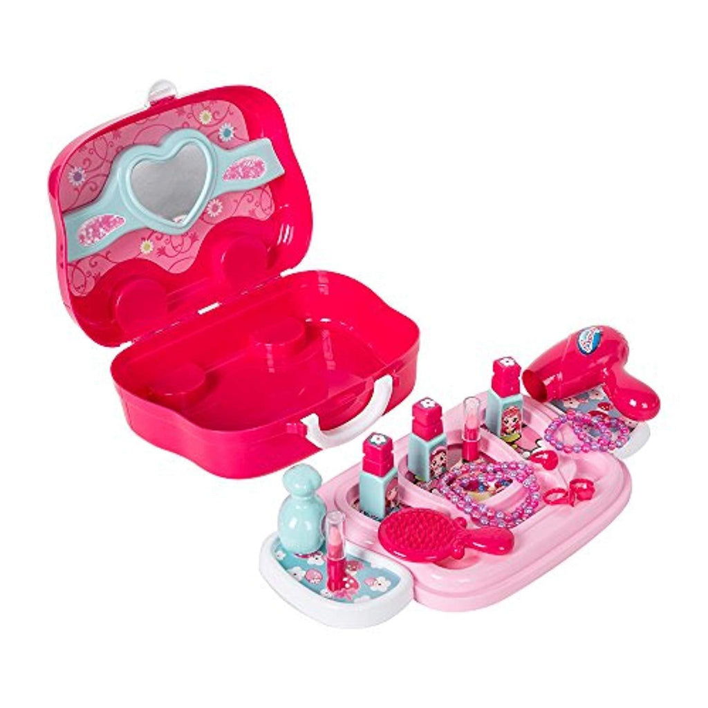 - Girls Beauty Set contains a hairdryer, hair comb, and brush, makeup brush, perfumes, lipstick, nail polish, finger ring, jewelry & more.