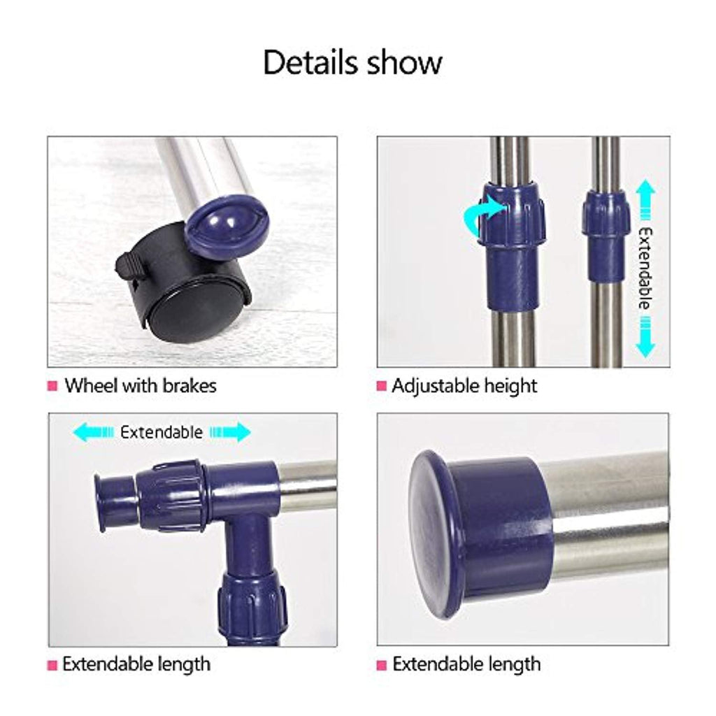 It's easy to assemble the clothes rack. The special joint buckle design make the rack is durable, stable and reliable. The wheels can be locked. You can take it to outdoor or leave it in your home. It use the best quality Stainless steel pipe and durable ABS. Both of them make the rack more sturdy and balance. You can hang your scarves and hats on the rod which is extending from both sides. If you are looking for such a product, don't hesitate to place an order!