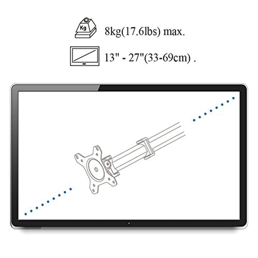 Maximum load: 8 kg(17.6lb),Up and down adjustment angle: 90 ° up & 35 °down DESK CLAMP – Mounts to the back of your desk via a heavy-duty C-clamp