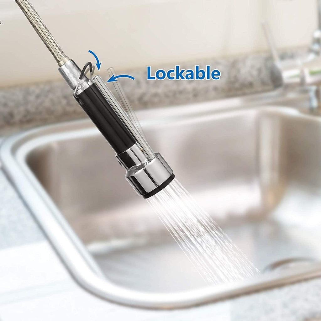 - Lockable design with pull-down sprayer allows water to flow out of the sprayer without squeezing. Make the sprayer lock, make your hands free.