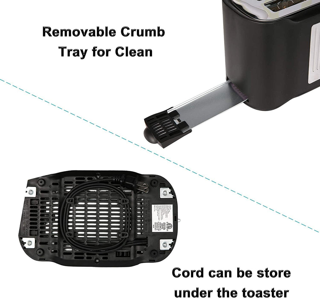 - 【Easy to Use, Clean & Store】Just set the heating set and push down the 2 bread toasters lift lever, then the toaster will start to work. The bottom of the bagel toaster is equipped with a removable crumb tray, so you can clean the tray directly by pulling out the crumbs. It has a fuss-free cord wrap underneath the toaster to manage unsightly power cords when finished using it.