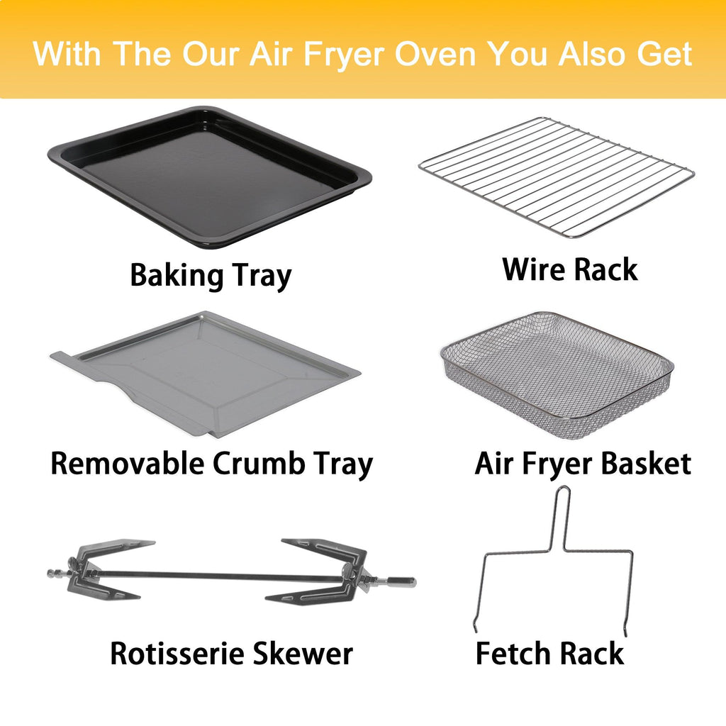 6 Accessories include: baking tray, wire rack, air fryer basket, removable crumb tray, rotisserie skewer, fetch rack.