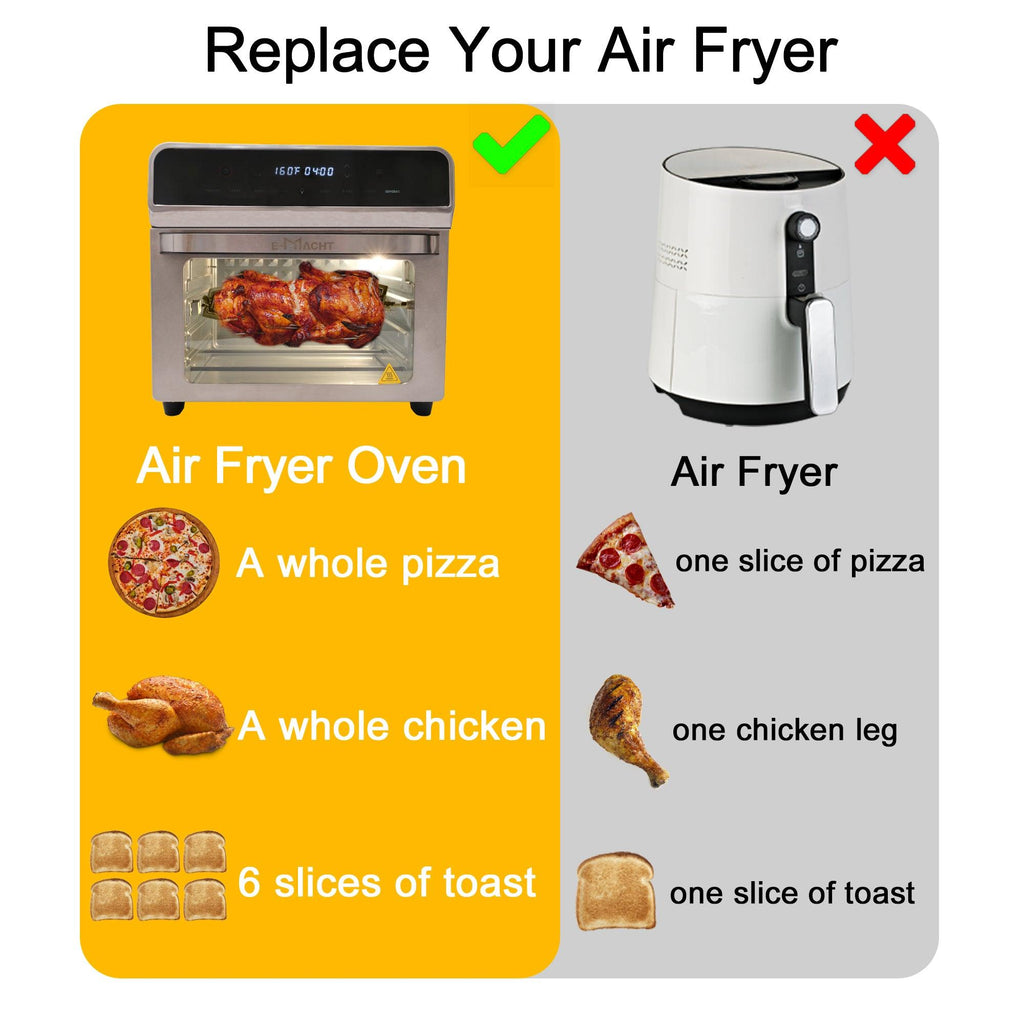 Healthy & Oil-Free: Our air fryer interior is made of food-grade stainless steel, ensuring health and no odor smell. Besides, it adopts healthy oil-free technology by 360° hot air circulation to reduce oil by 85% compared to traditional frying. Own a toaster oven air fryer combo, you will get a frying pan, a baking oven, an electirc grill, a roaster oven, a microwave oven, a dehydrator, a rotisserie and an air fryer. All in one so you don't need to buy a lot of machines, saving much space.