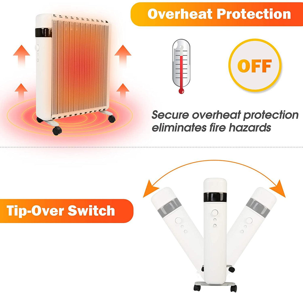 - The heater has dual protection. Built in automatic overheat protection, tip-over power-off protection, and wrap-type anti-scalding, ensure the safety and prevent accident and your family from being injured. Automatic temperature control is effective for electricity saving. Fire-resistant and flame-retardant materials are safety and fire protection.