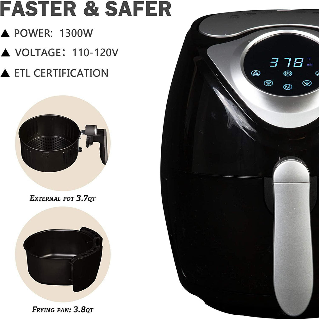 - ETL Certification, 120V, 1300W. Package Include: Air Fryer, Use Manuel, Recipes. 360° Circulation Hot Air Technology.