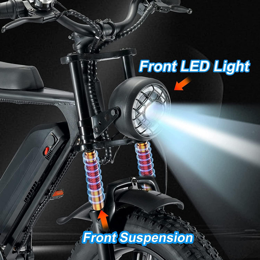 20" Fat Tire & Shimano 7-Level: 20 inch fat tire and Shimano 7 levels transmission system will satisfy all your speed needs for any terrain. This bike also equips with an LED light provide lighting during the night.